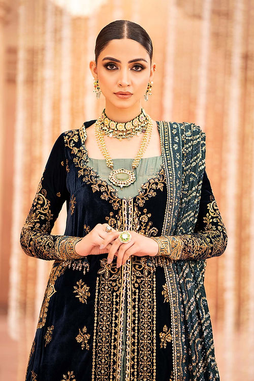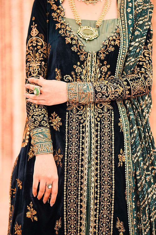 Set on a rich cobalt velvet base, this Look effortlessly blends tradition with contemporary flair. Curated in an open front style that adds a touch of modernity to the timeless grace of the teal velvet, creating a silhouette that is both understated and glamorous. An array of gold embroideries are woven elaborately, honouring the intricacies of zardozi embellishments. The kameez has been paired with a crushed masoori gown while the star of this Look is the silk shawl, embroidered with a magnificent ambi pattern.