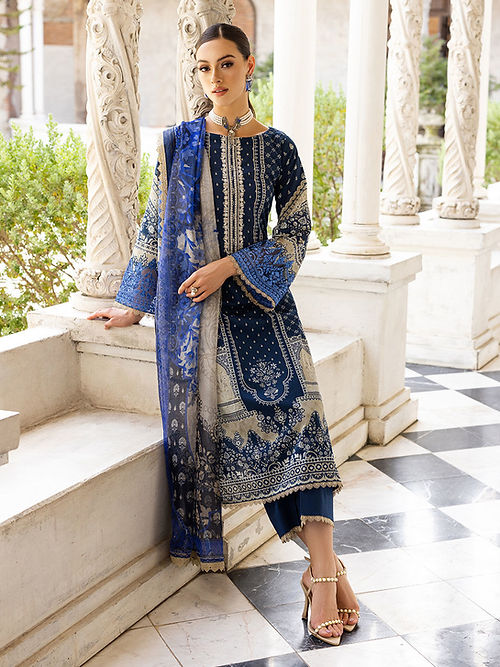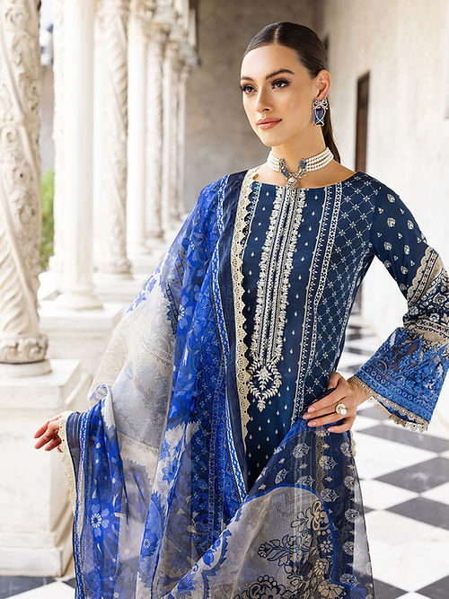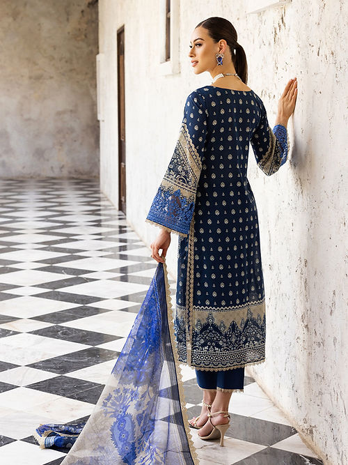 This Harmonious Blend Of Blue Canvas Is Beautifully Crafted With The Exquisite Print. Detailed Print On Dupatta And Elevated Embroidery On Neckline And Sleeves Add Sophistication And Elegance To The Attire.