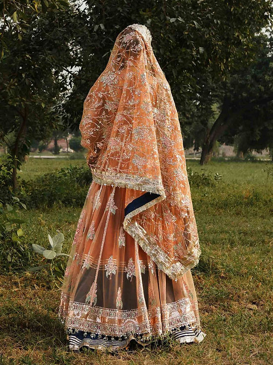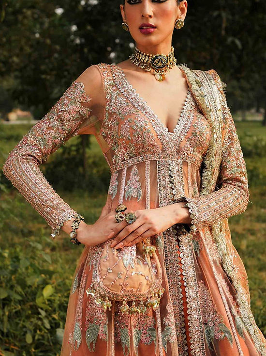A gorgeous coral peach ensemble adds to the opulence of this attire with beautiful intricate multicolored embroideries enhanced with buggle beads and sequins. A pulchritudinous composition is further modernized with color block Korean Raw Silk lehenga and Beautifully composed Peach Net Dupatta .