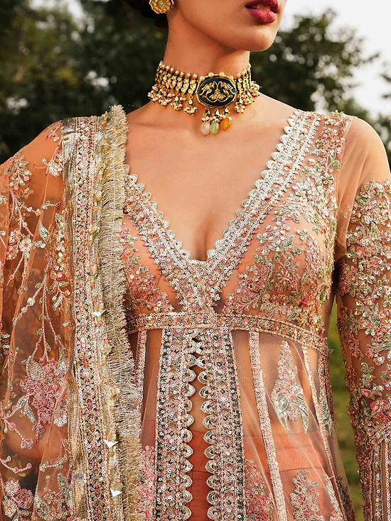 From time to time beading/ sequences may get displaced and this is not regarded as a fault but is due to the nature of the work. These garments should be worn with care.