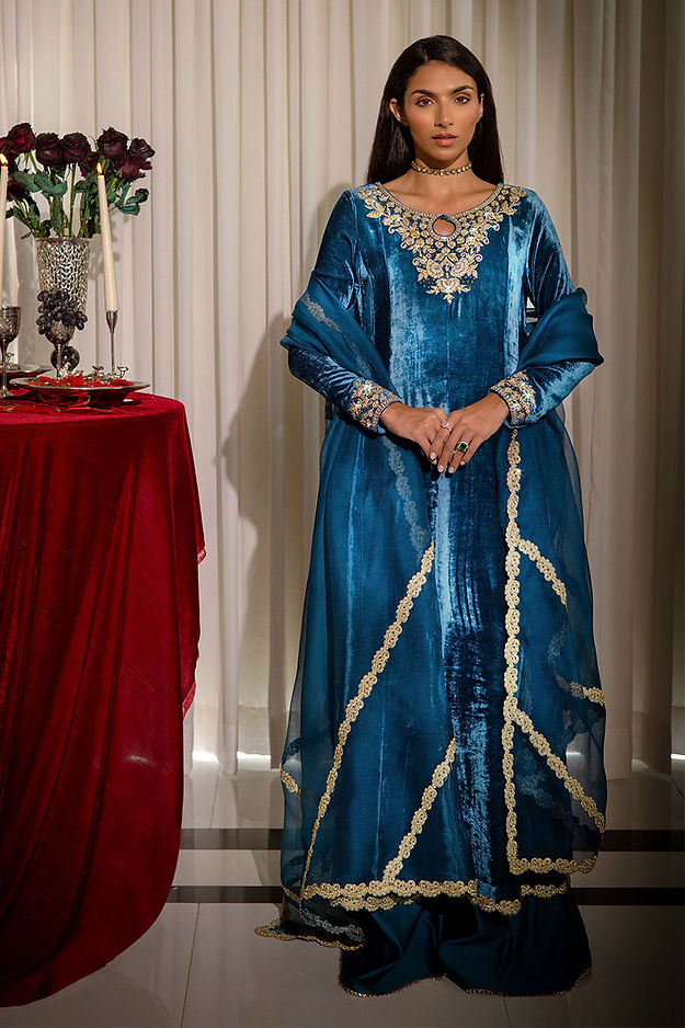 A sophisticated kalidaar ensemble featuring is adorned with intricate gold appliqué work. Accompanying dhaka pants with a net organza duppata which boasts captivating appliqué designs on all four sides. Exquisite dabka, silver, gold nakshi, sequin work, and gota tikki stones embellish the embroidery, creating a truly luxurious piece.