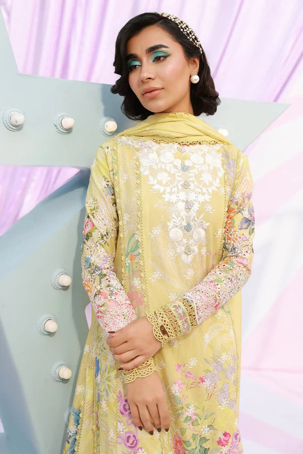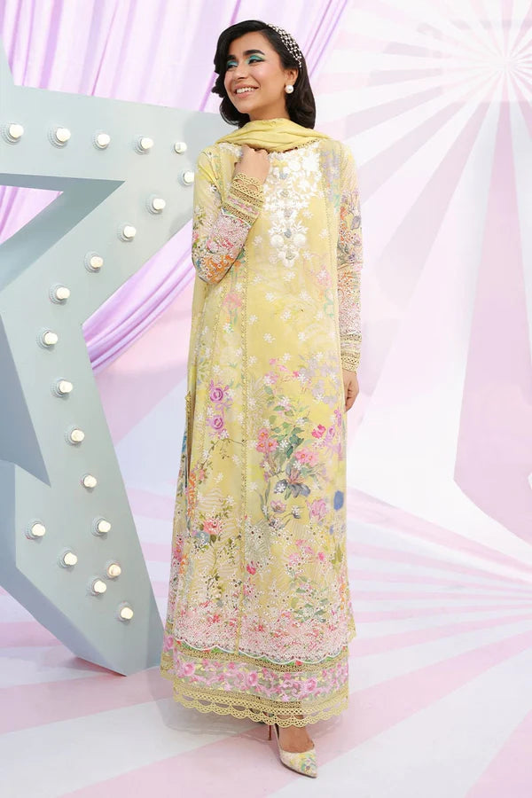 A Lemon yellow printed schiffli kalidar featuring a playful pastel print, accented with off-white embroidery on the neckline and pastel butterfly buttons. The sleeves and hem are detailed with delicate pastel embroidery and lace borders. Paired with yellow straight pants and a medium silk dupatta with softly dyed lace edging, creating a fresh and elegant ensemble.