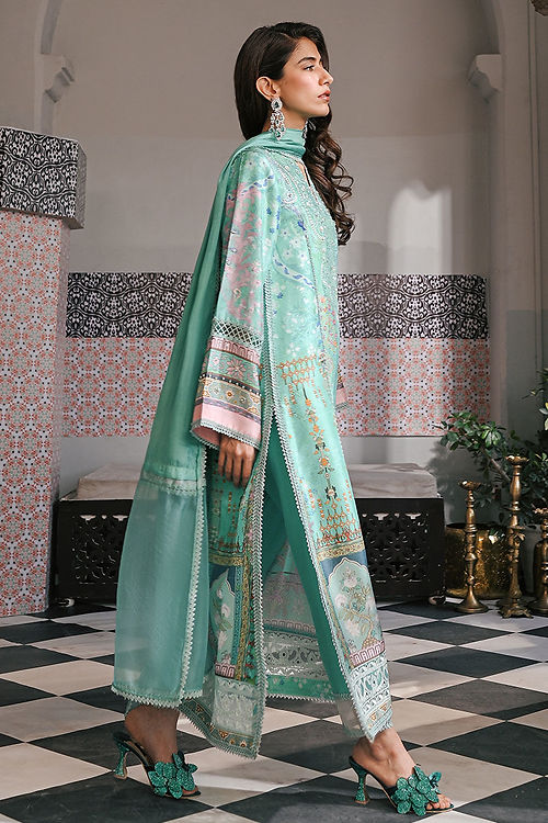 Indulge in the charm of this digitally printed A-line raw silk shirt, adorned with light handwork featuring sequins, cut dana, and rhinestones. Intricate lace details delicately enhance its allure, adding a touch of sophistication to its design. The color palette of blue misty envelops the ensemble in a serene ambiance, exuding elegance and grace. Accompanied by a medium silk dupatta with organza and print detailing, this ensemble is a testament to refined beauty and timeless style.