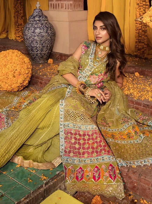 Description: The Star of the Outfit, the gharara, which can be stitched as a lehnga or an azaar, is made up of a hand printed booti with cascading borders of chata patti in the brightest, prettiest shades of fuscia and purple and ghaaraembroidery. Eclectic and modern with a nod to the past, this is the wedding outfit that dreams are made of.
