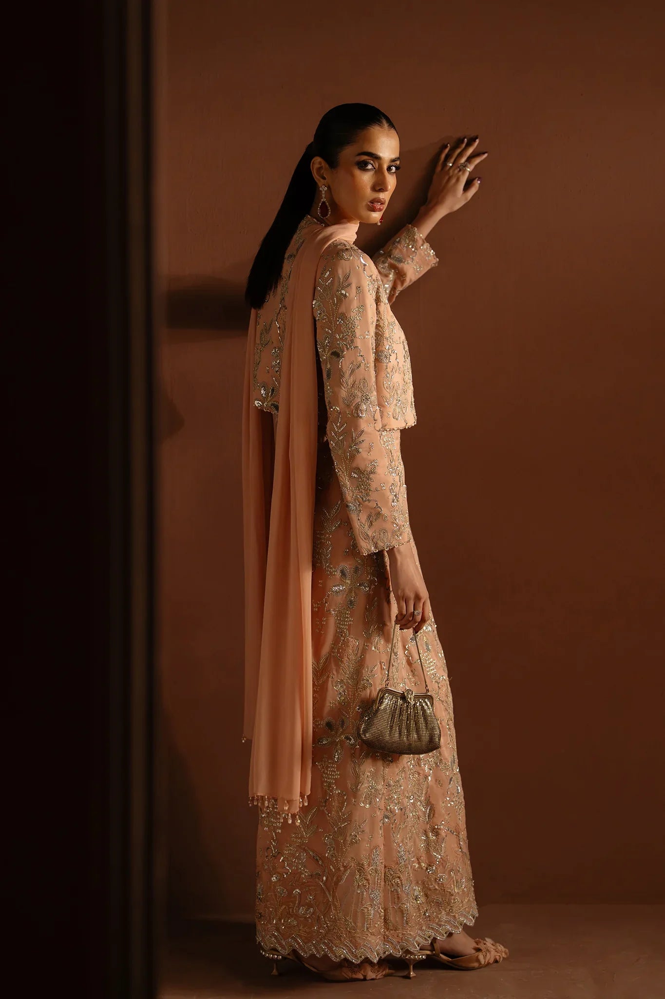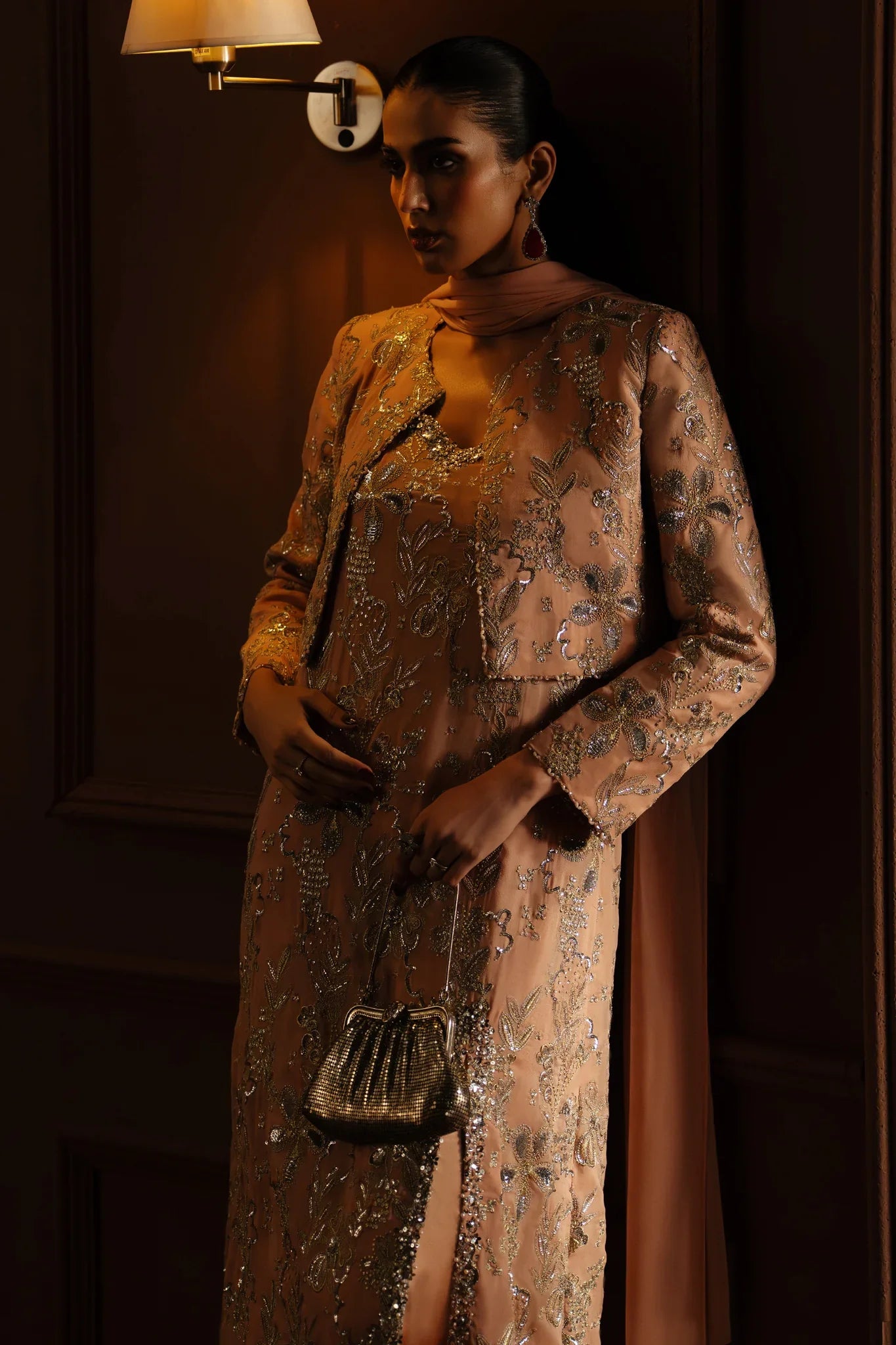 Rosée Sérénité is crafted on a tender blush canvas, delicately illuminated with fine tilla and threadwork embroidery that flows across the surface in intricate, floral-inspired patterns. The detailing feels light yet luminous, lending the ensemble an air of effortless refinement and quiet romance.