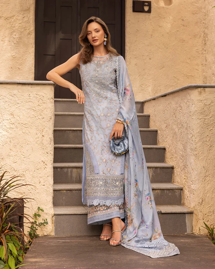 A realm defined by the seamless fusion of elegance and modernity, Liana brings forth the brilliance of threadwork on an embroidered lawn canvas. The dusty blue lawn shirt features lavish organza and net patches and is complemented with a digitally printed dupatta. This set comes with Cambric trousers for a look that feels pretty, playful and summer ready.