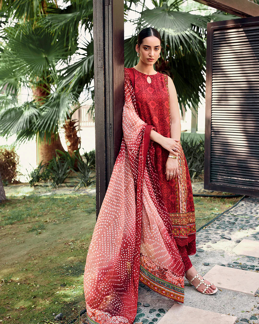 Showcasing the inimitable FS aesthetic, Gloriana is a delightful ode to artistic finesse. Crafted on opulent silk, the shirt features a blooming floral print in a captivating red hue. Paired with embroidered silk culottes and a floaty chiffon dupatta featuring a breathtaking floral print, this piece is sure to become your favorite wardrobe staple this season.
