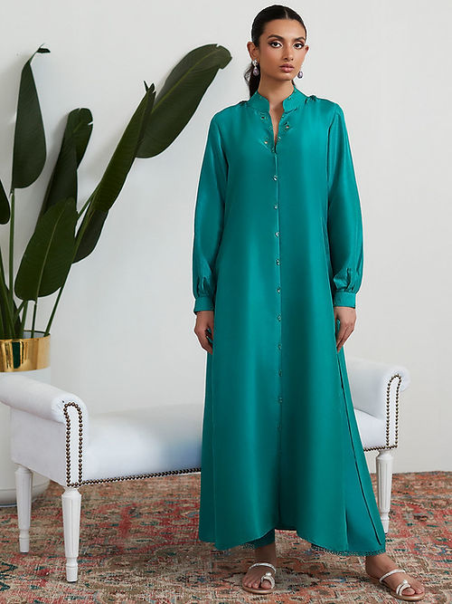 The collar with slits that sits close to the neck, as well as the cuffed sleeves are adorned with unique, delicate cutwork that subtly draws the eye to it. The shirt is embellished with handmade buttons that are adorned with sequence and rhinestones.