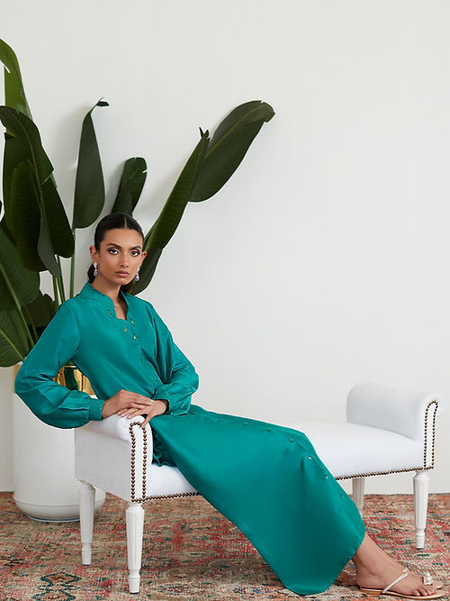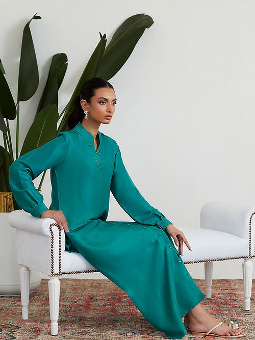 Cut from pure raw silk in an emerald hue the impeccable tailoring and sleek lines of this ensemble will have you reaching for it whenever you really want to make an impact!