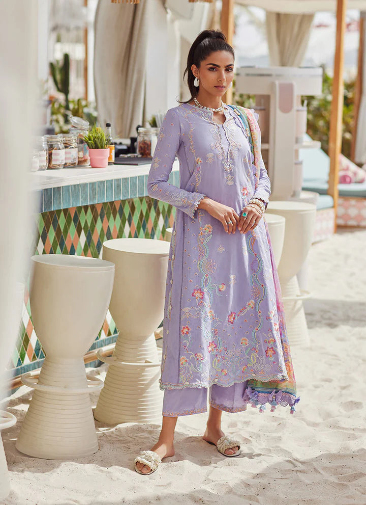 Reinventing your classic lavender outfit for a look easily carried from day to night. A soft PIMA lawn featuring delicate floral and geometric embroideries across the shirt, unmissable borders and floral scalloped trimmings. An airy, floaty pure chiffon dupatta featuring the uplifting shades of a pink sunset make this outfit truly unforgettable. The comfortable, jacquard pants will keep you breezy day or night.Liliana Lavender is one of those modern classics, you just simply love forever!