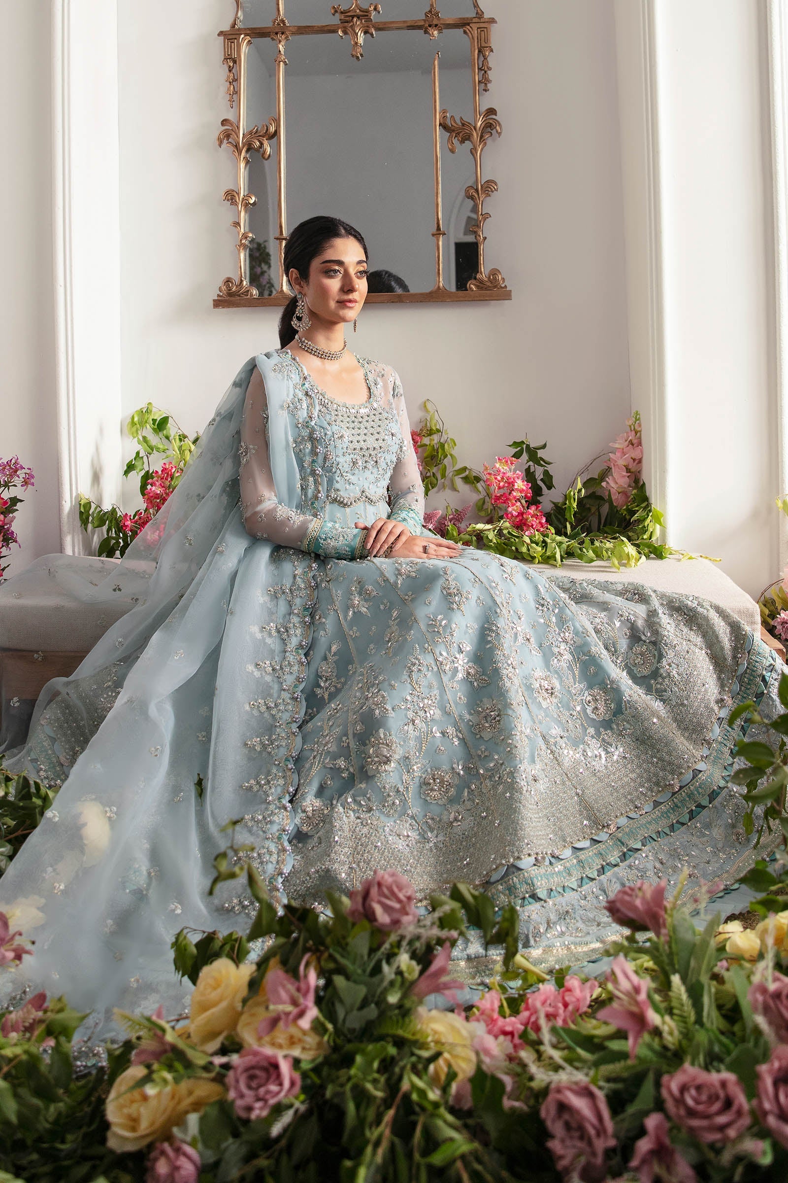Exquisitely fashioned, 'Mirzeta' is an inspiring masterpiece, a canvas adorned with the artistry of seafoam, sage, and laguna hues, meticulously etched in intricate embroidery that graces every inch of the dress. The sheer fabric cascades gracefully to exude timeless and graceful femininity, complemented by a cinched waist. The ensemble is completed with an embelished organza dupatta and a peeking lehenga, elevating it to instant classic status with its timeless allure.