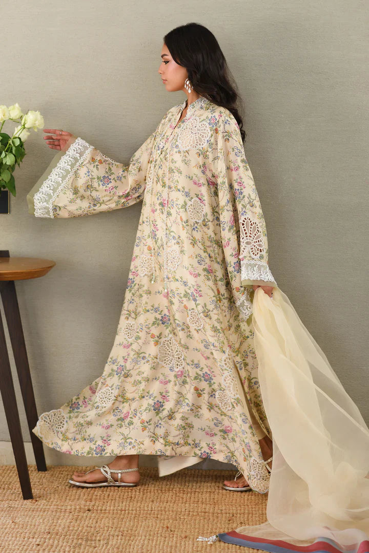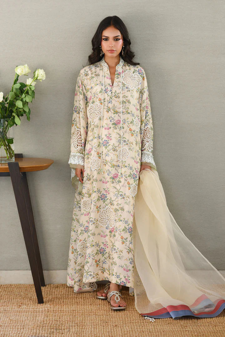 In a soft shade of ivory, this ensemble whispers the serenity of a morning mist, where every detail is woven with timeless grace. The floral print, delicately laid across the shirt, is adorned with intricate cutwork motifs, shimmering sequins, radiant stones, cut dana, and crystals - each element adding a refined touch of sparkle. Crafted from luxurious 60-gram pure silk, the fabric drapes with effortless elegance, enhancing the ensemble’s overall allure.