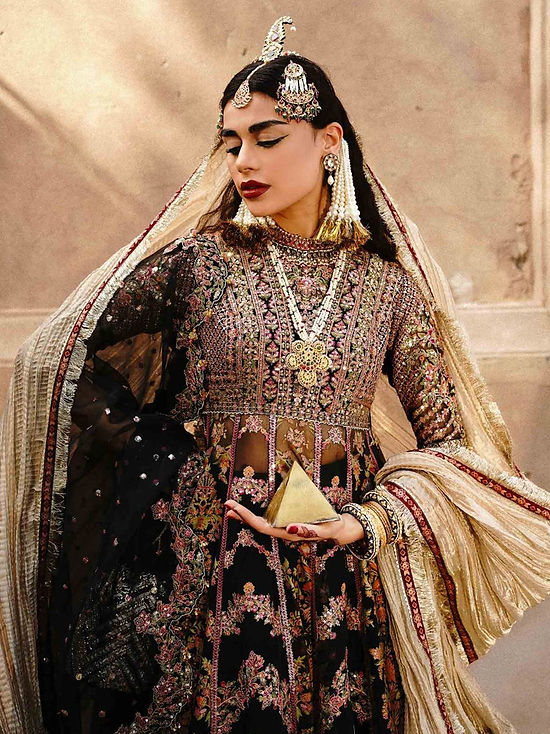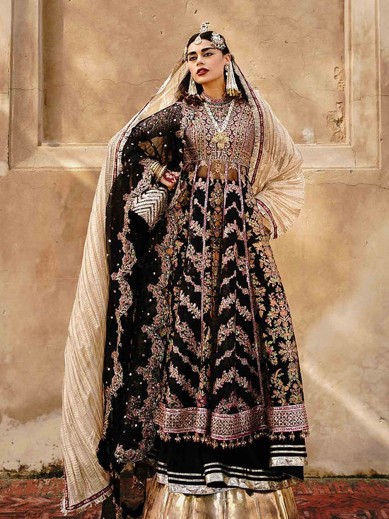 This murky black organza peshwas is an epitome of perfection and show stopper bling, donned with scintillating pulchritudinous foliage motifs embroidered in shades of green, pinks, orange and purples.Bodice further enhanced with buggle beads and sequins. Paired up with black lehenga and organza scalloped dupatta with the sequins spray.