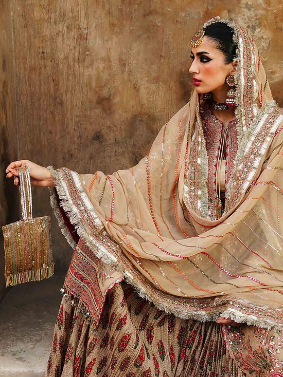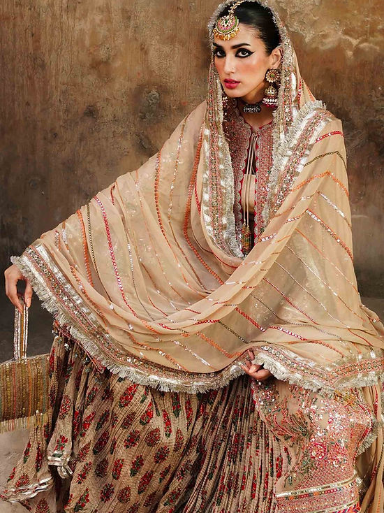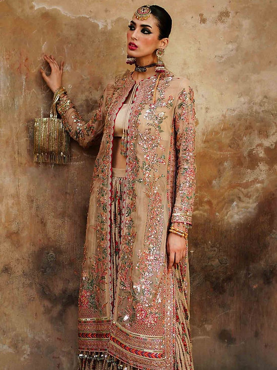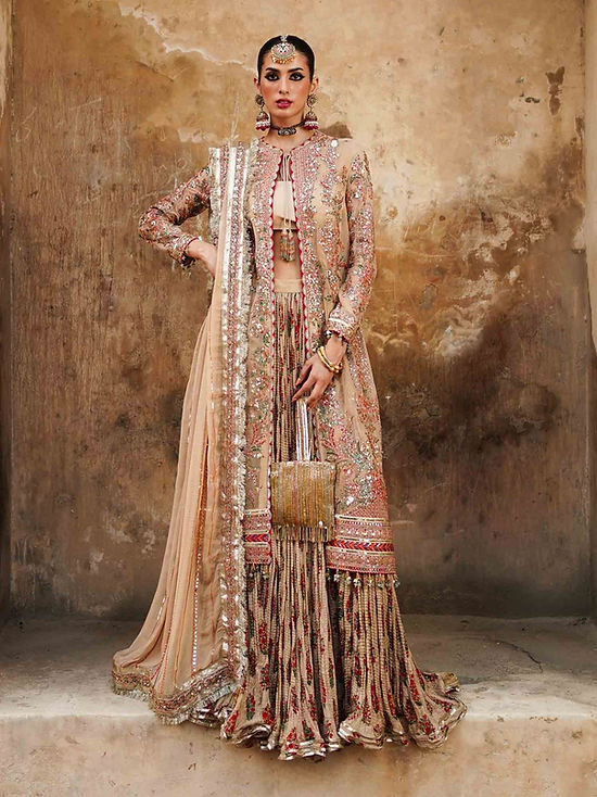 This beige ensemble has been exquisitely crafted with utmost precision. A beautiful elaboration of floral branches and motifs embroidered in the shades of pink, orange and teal. This embroidery is further enhanced with sequins and buggle beads. Paired up with digital printed crushed sharara and linear embroidered dupatta.