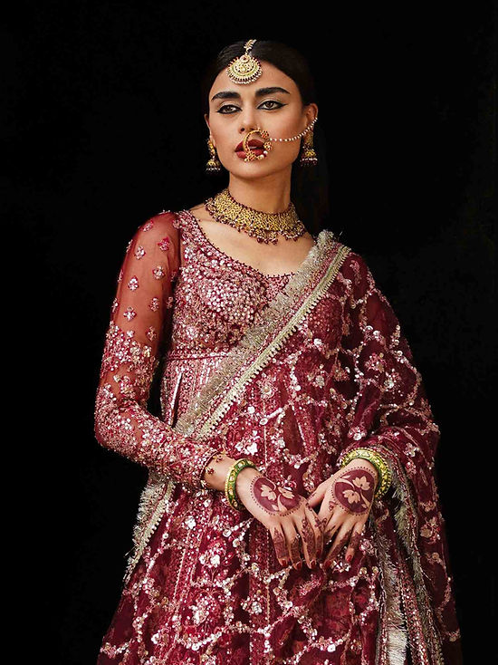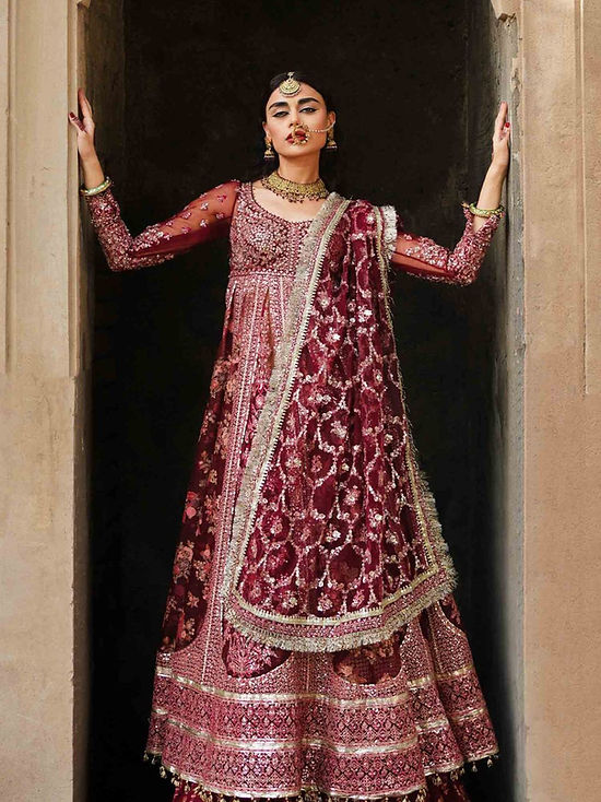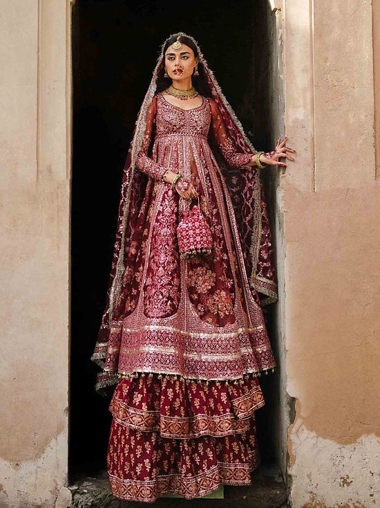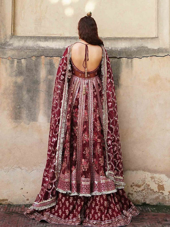 This deep berry burgundy ensemble is significantly opulent and magnificent with monotone color scheme. This stunner traditional peshwas and embroidery is further emphasised with additional glitz of sequins adding an extra bling to the festive season with its screen printed crushed sharara and scintillating sequined jaal dupatta.