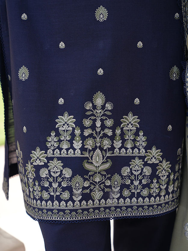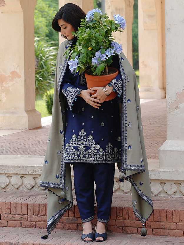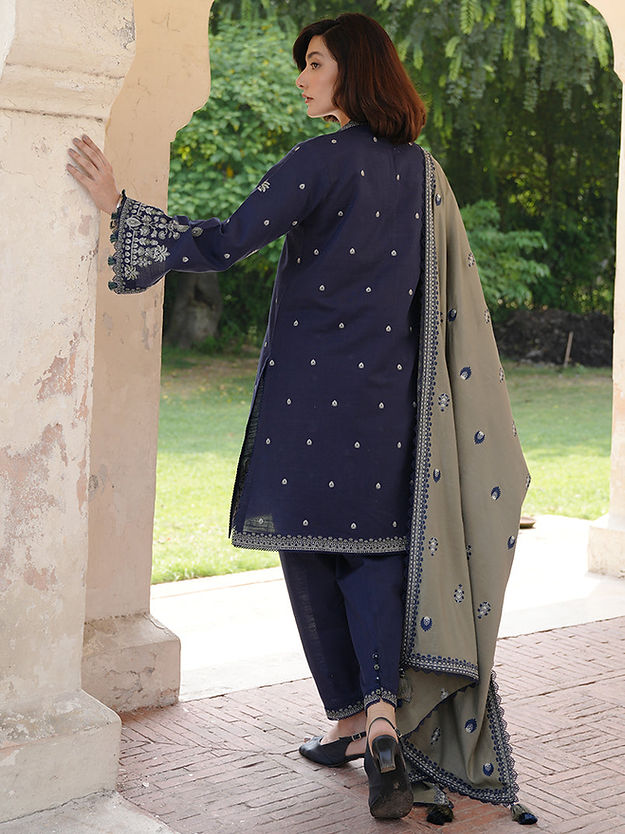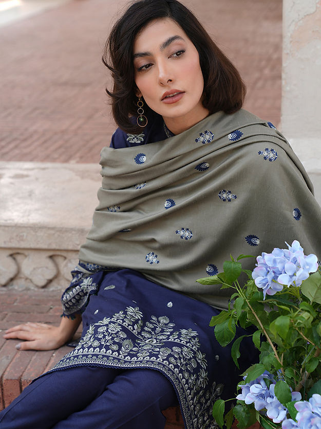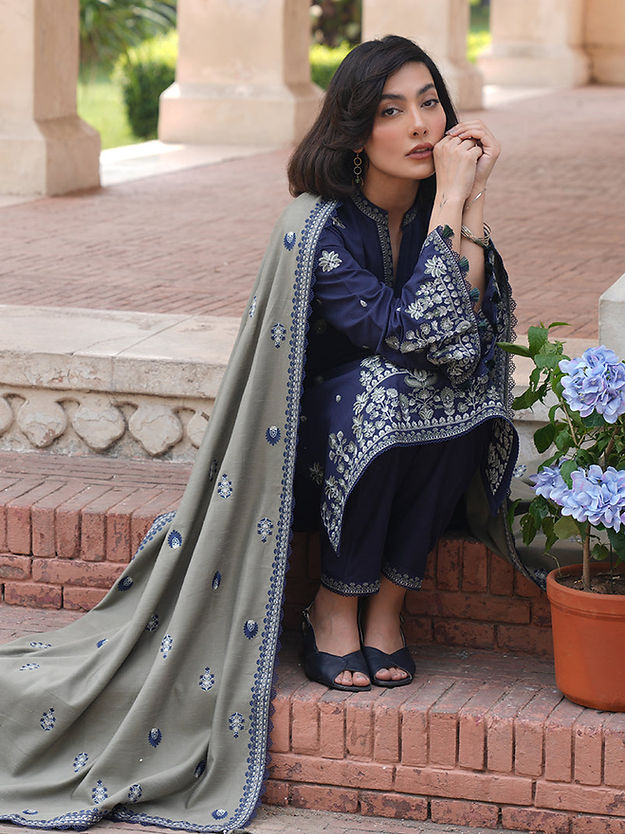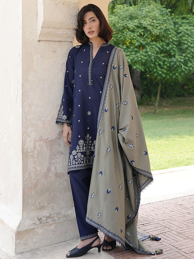 Veyra in Navy/Forest Sage from our Winterkari '24 Collection. An embroidered navy khaddar 3-piece outfit paired with forest sage acrylic shawl.