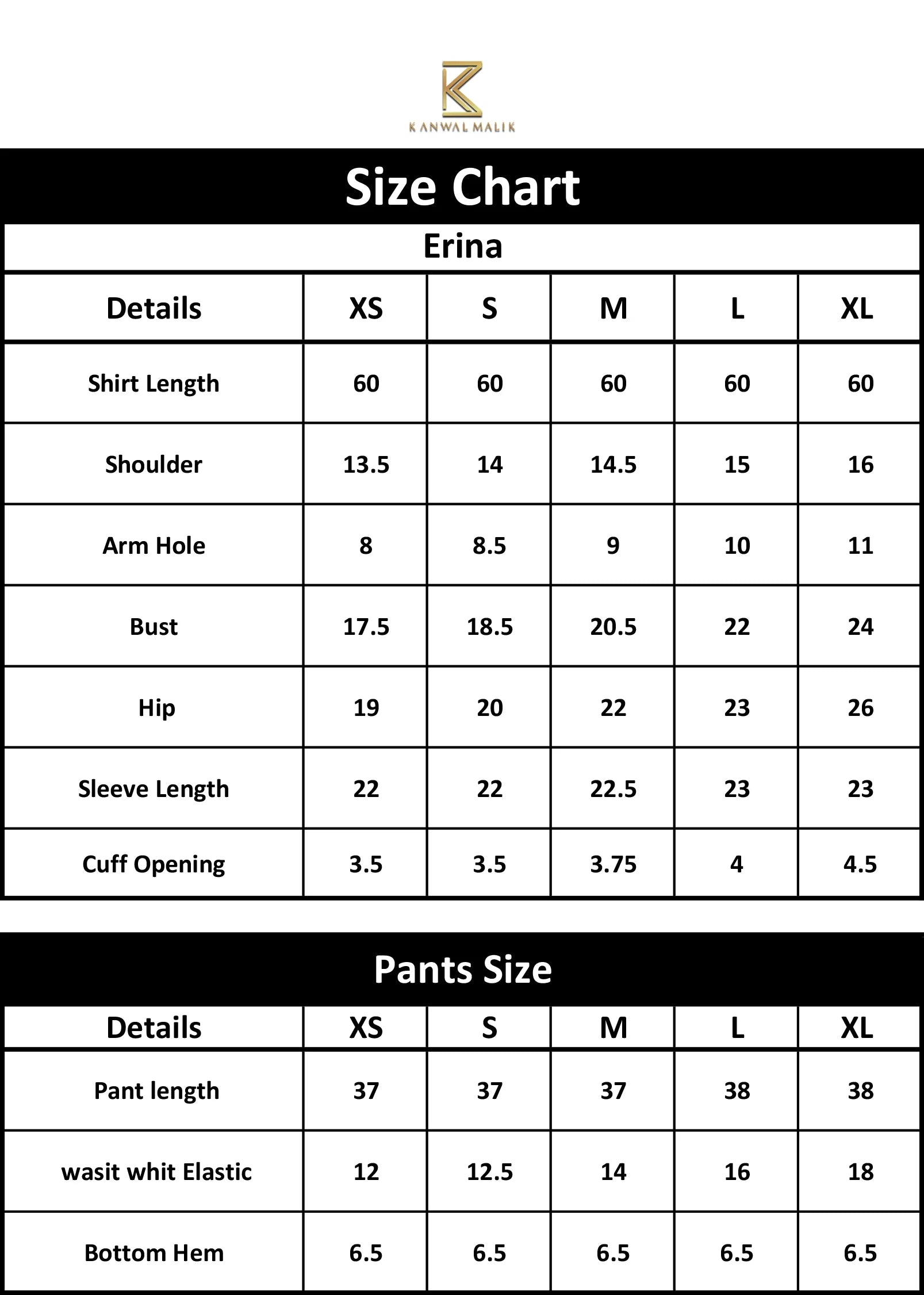 Erina emerges as a striking testament to contemporary artistry, where modernity meets impeccable craftsmanship. The deep teal silhouette drapes with fluidity and grace, its texture enriched by meticulous hand detailing that infuses life into every inch. The tailored fit of the shirt and cigarette pants creates a sharp, refined contrast to the flowing elegance of the long silhouette, while the Kathan organza dupatta, scattered with a subtle yet impactful spray of embellishments, adds an ethereal finish. Erina isn't just a design; it’s a curated experience in luxury.