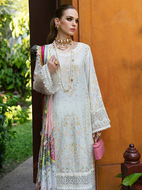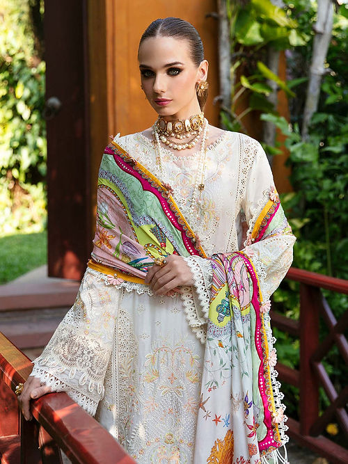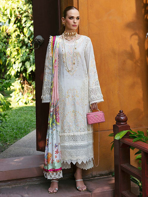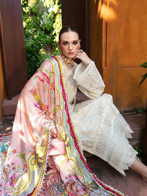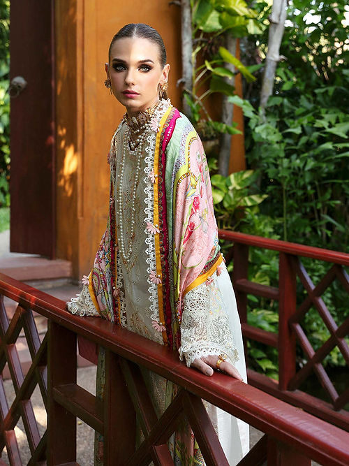 Prepared to be enchanted by the delicate embroidery that weaves an intricate Jaal and florals moti. Luxurious schiffli elevates this masterpiece and defines true sophistication. The pure printed silk dupatta adds an indistinct elegance and refinement. Paired with culotte pants with a dobby technique creates a sense of luxury. This grand design stands tall promising to captivate hearts and leave an delible mark in the collection.