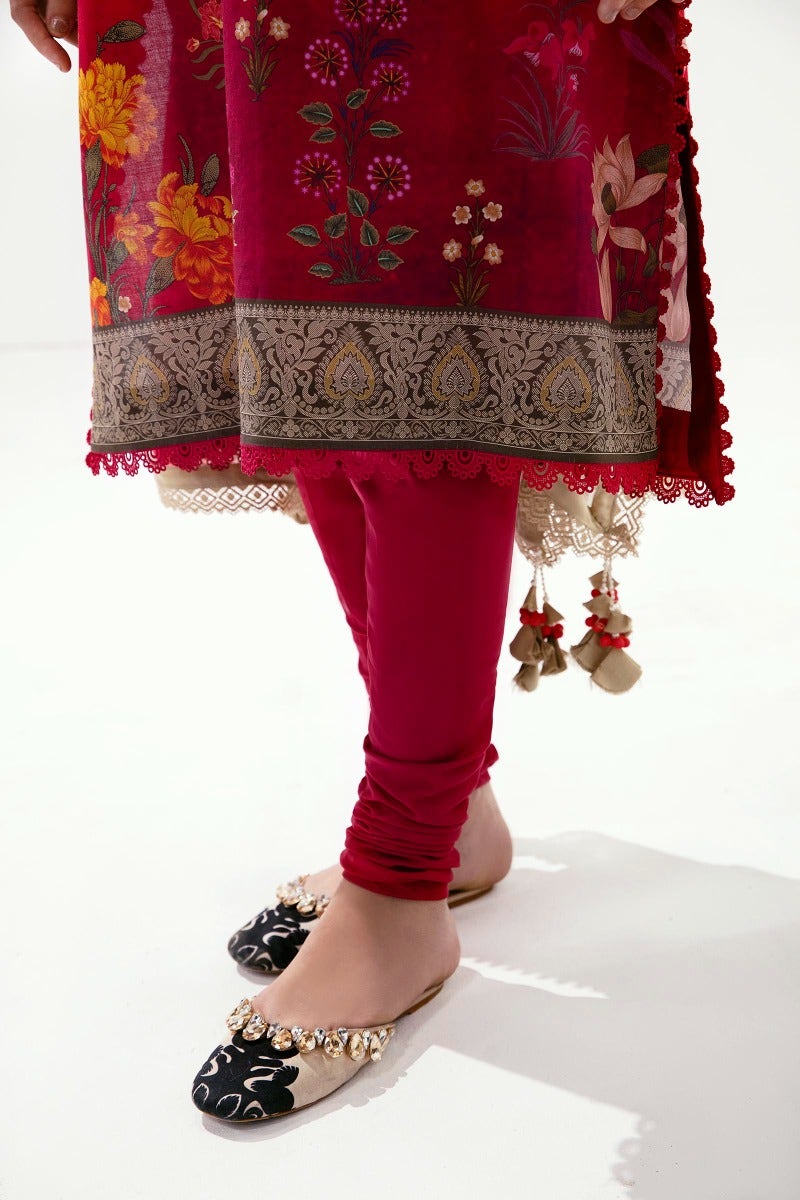 Brimming with femininity, this exquisite lawn silhouette features a display of mughal inspired floral elements in a kaleidoscope of vivid hues. It is paired with a rotary printed flowing drape and perfectly coordinated pants, lending an air of effortless sophistication.