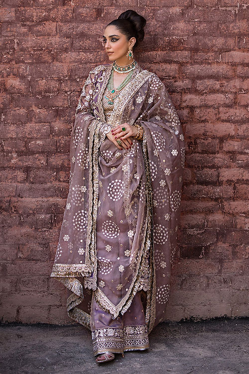 Indulge in the enchanting allure of the 'Talia' ensemble, a masterpiece that exudes elegance in a mauve shade with a hint of enchanting purple-grey undertones. Crafted from exquisite tissue fabric, the ensemble features intricate tilla embroidery, along with allover embellishments and mirror work that create a breathtaking symphony of opulence.