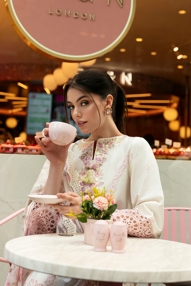 A creamy confection of refined elegance. This ensemble features a chikan embroidered lawn shirt with delicate organza lace sleeves and a sequinned neckline adorned with embellished tassels. Intricate crochet lace graces the front, side slits, and trouser, while a printed chiffon dupatta adds a whisper of romance to this sophisticated, coffee-inspired creation.