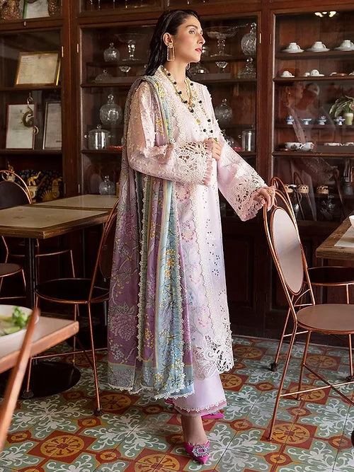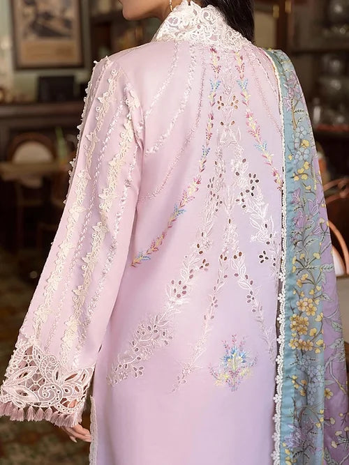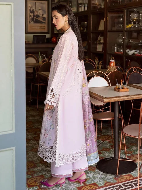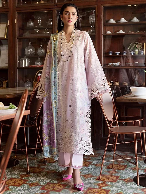 AMARA is an extraordinary ensemble that is crafted on a subtle pink canvas. With chikan embroidered panels and lawn embroidered sleeves, Amara's breathtaking silhouette can be a perfect option for the festive season. The embroidered front neckline and daman complement the ensemble in a bewitching manner. The detailed touches that include laser cuts, back borders and crochet lace only add to the finesse that Amara has to offer. Lastly, a pure silk dupatta can never go wrong, pairing with an attire as striking and radiant as this one.