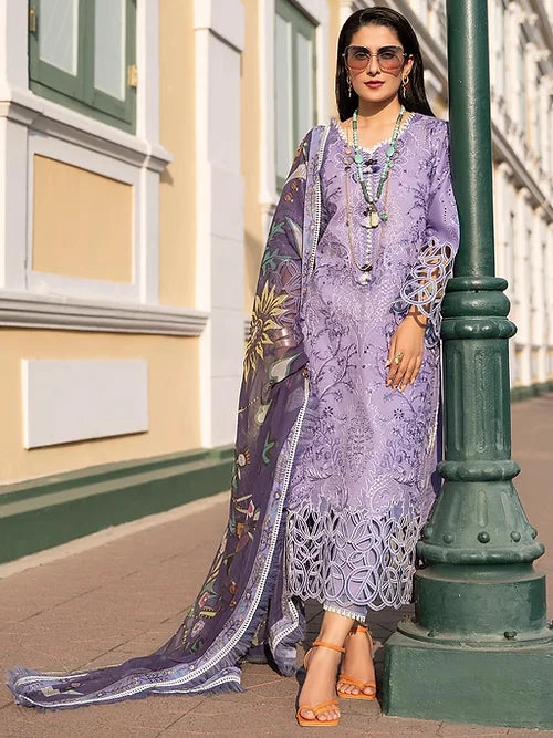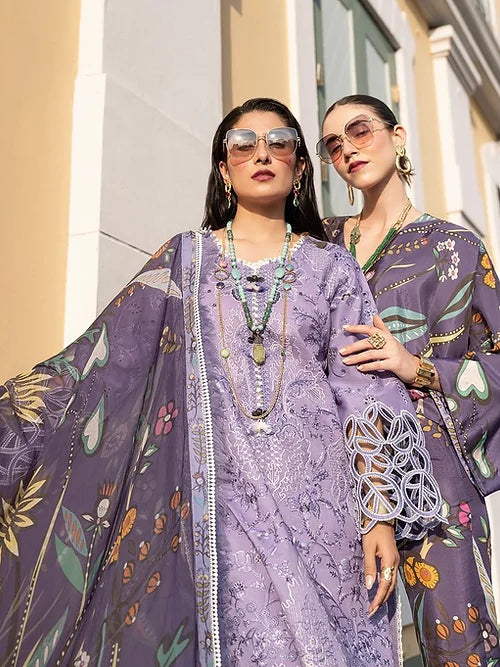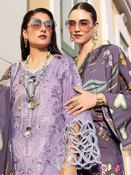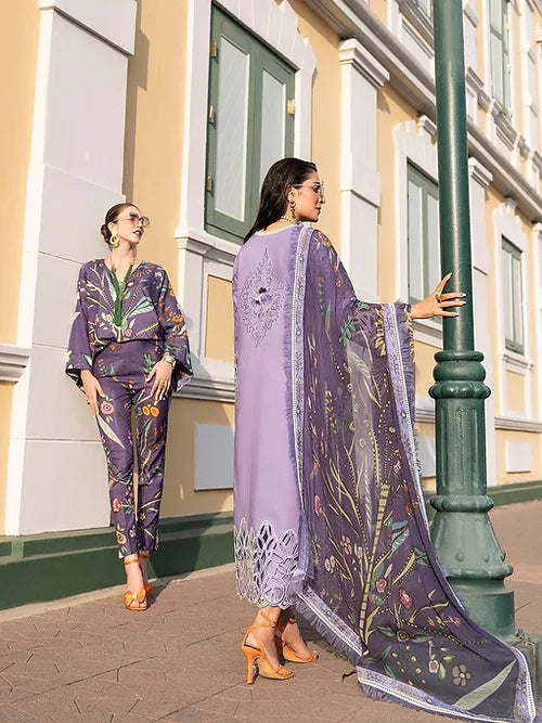 We are so excited to reveal ARIYA which pushes the envelop this season with its novel and unique Peruvian violet canvas. Violet and lavender resham is embedded in an array of florals all over the shirt front and sleeves. Black and white geometric pattern circles around the floral web to create an immaculate look. It is paired with a chiffon digital printed dupata. Hand made tassels further elevate the beauty of this design.