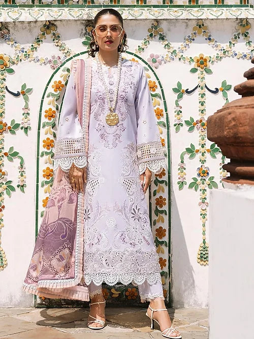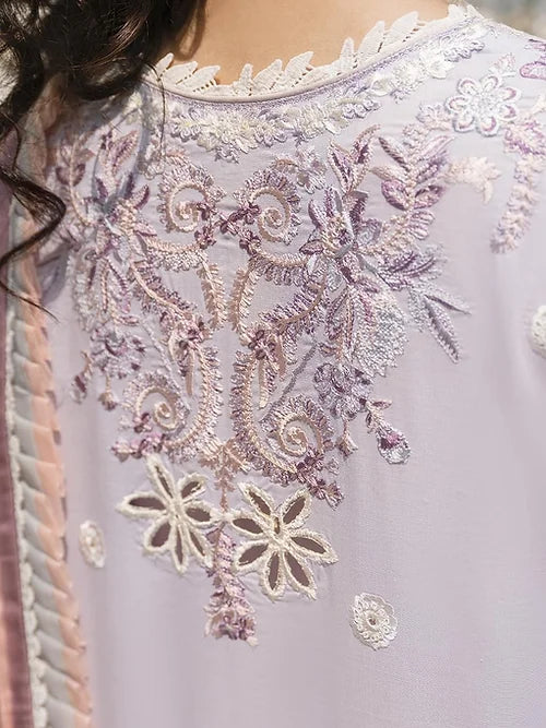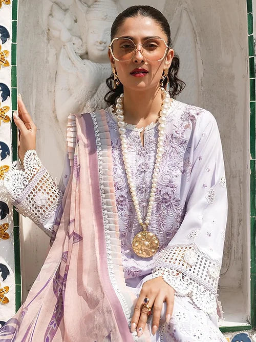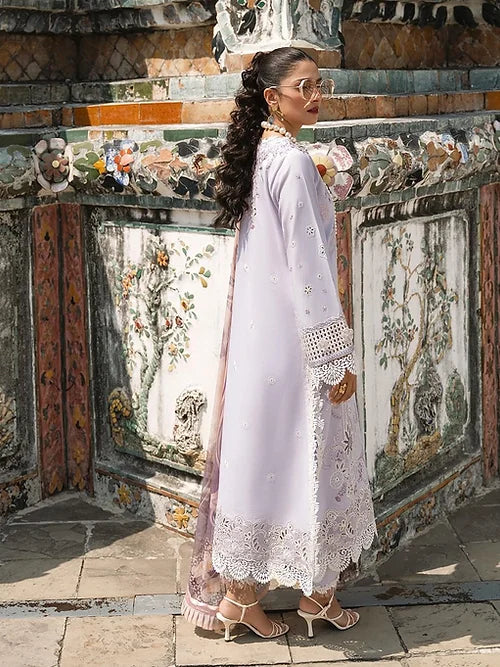 An attire that is curated on a light lavender hue, BANYEN’s highlight is the chikan floral embroidered panels. The canvas is creating a style statement with subtleness and grace, which are complemented by the laser cuts on front and back border. 3D embroidered flowers are the standout component of Banyen. The ethereal pure chiffon dupatta completed the exquisite look of the ensemble.