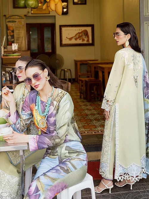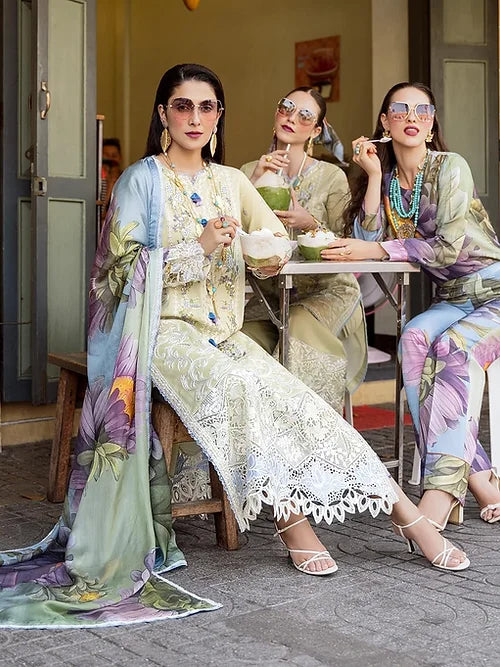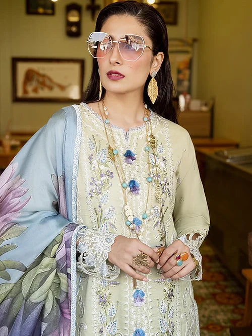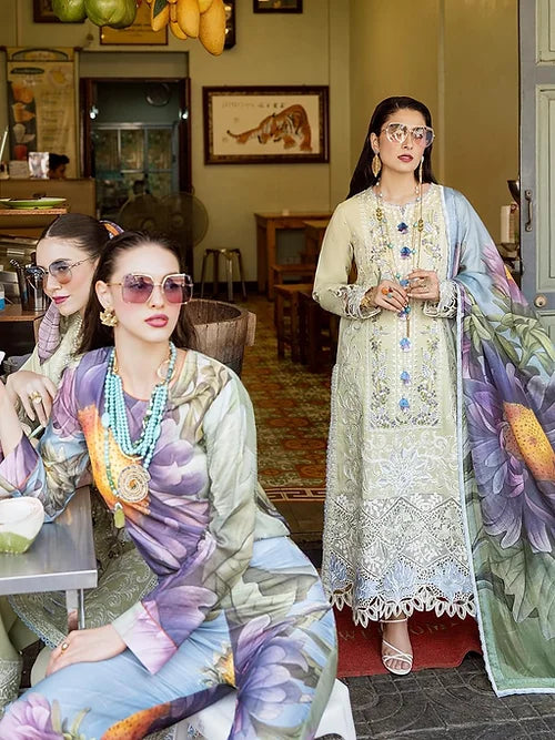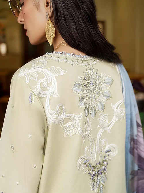 EMON is a design that is one of our personal favorites. The article is crafted on a nude canvas with a perfect hint of purple and blue, creating a very tropic look. The embroidered lawn front is inspired by the blooming floras of the coming season. This is an attire for every woman out there as it’s detailed work of tassels for neckline, sleeve motifs and appliqued damans give it an ethereal charm. Emon is an ensemble that cannot be missed.