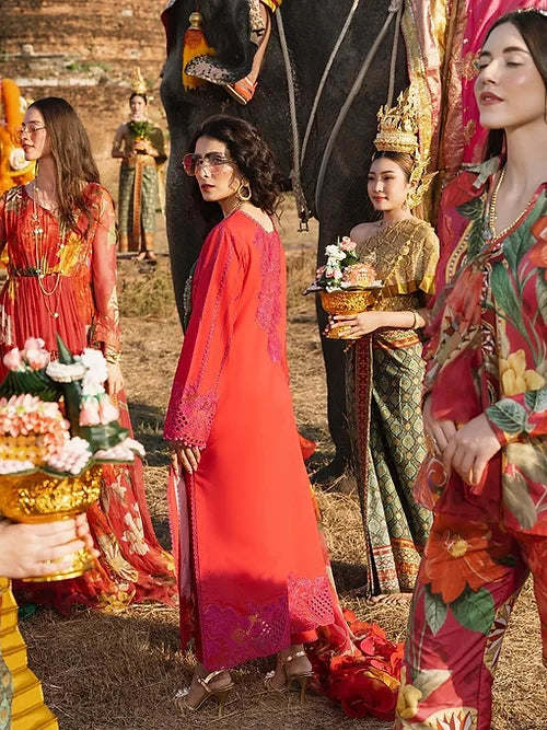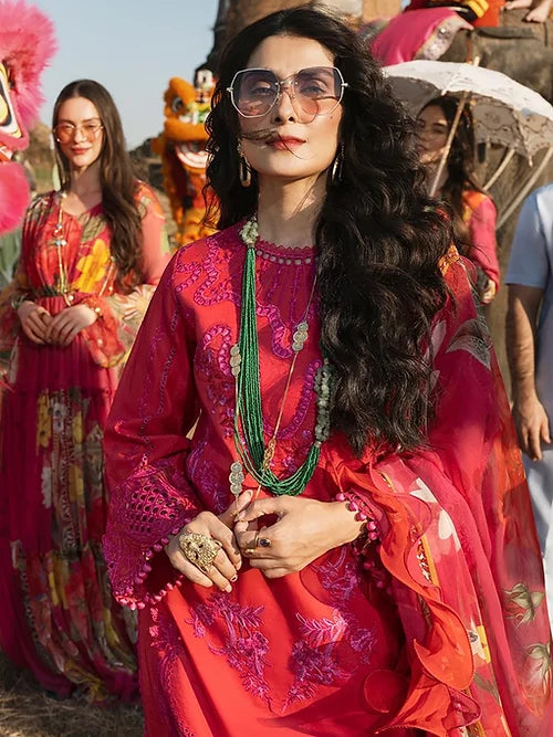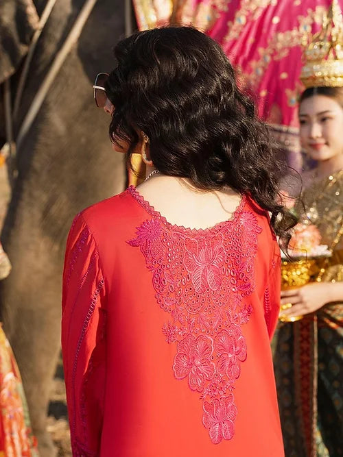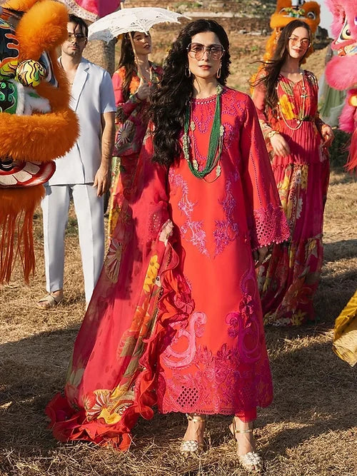 It all starts with selection of the perfect color palette when designing any collection. We were sure that any spring summer collection is incomplete without a stunning shade of red. We dawdled to come up with this hot and sensual berry red color which exudes royalty, grace and yet stands out from any prototypical red shade. We adorned it with a luscious pink resham embroidery incorporated with several techniques simultaneously. Lazer cut and silk appliqué have both been amalgamated on the canvas to produce an outfit that speaks for itself.