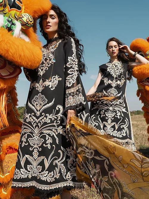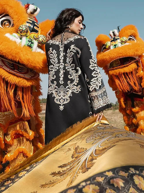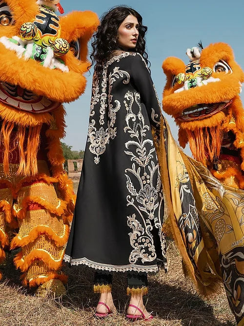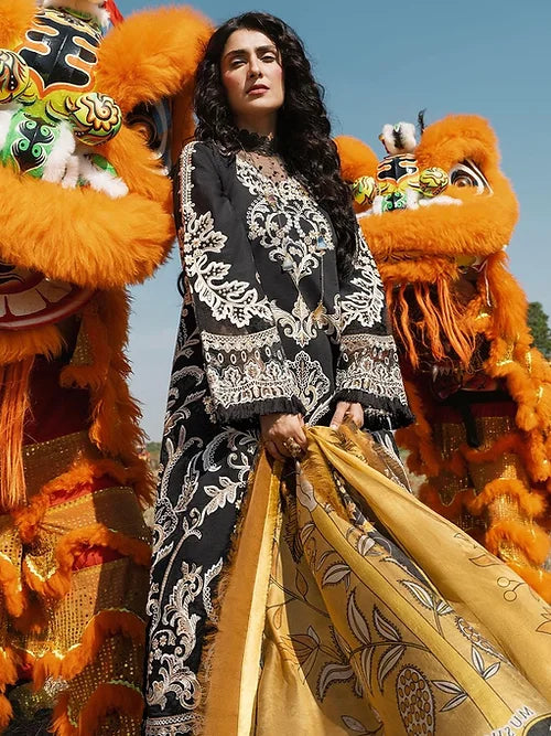 LAWANA Spring 2023 would have been incomplete without this black and gold celestial number SAWIKA. Floral and geometric patterns in mustard, wax yellow and white resham have been beautifully amalgamated with Chikan embroidery to create this masterpiece. A striking gold and black silk dupatta elevates SAWIKA even more.