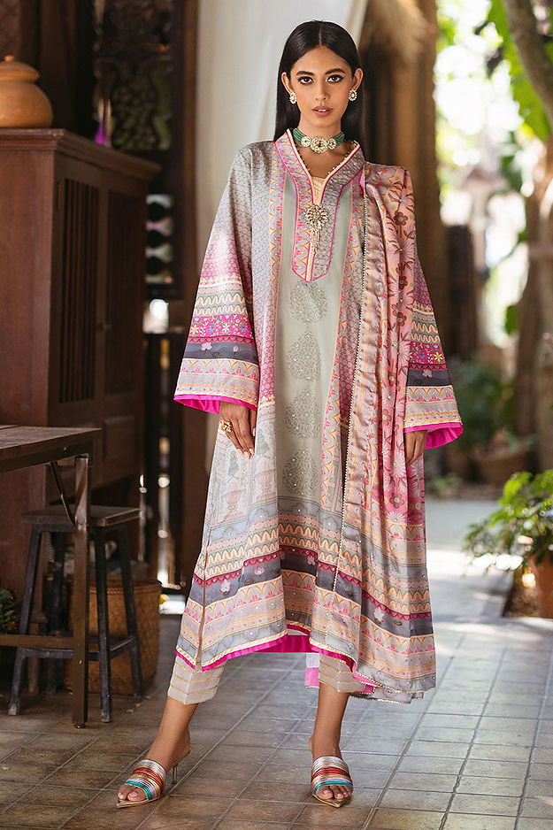 Taffy is a whimsical blend of grey and pink, crafted from luxurious printed raw silk. This outfit features playful embellishments that bring a fresh vibrancy, while the flowing silk dupatta drapes effortlessly, enhancing your silhouette. With Taffy, embrace a chic yet playful aesthetic.