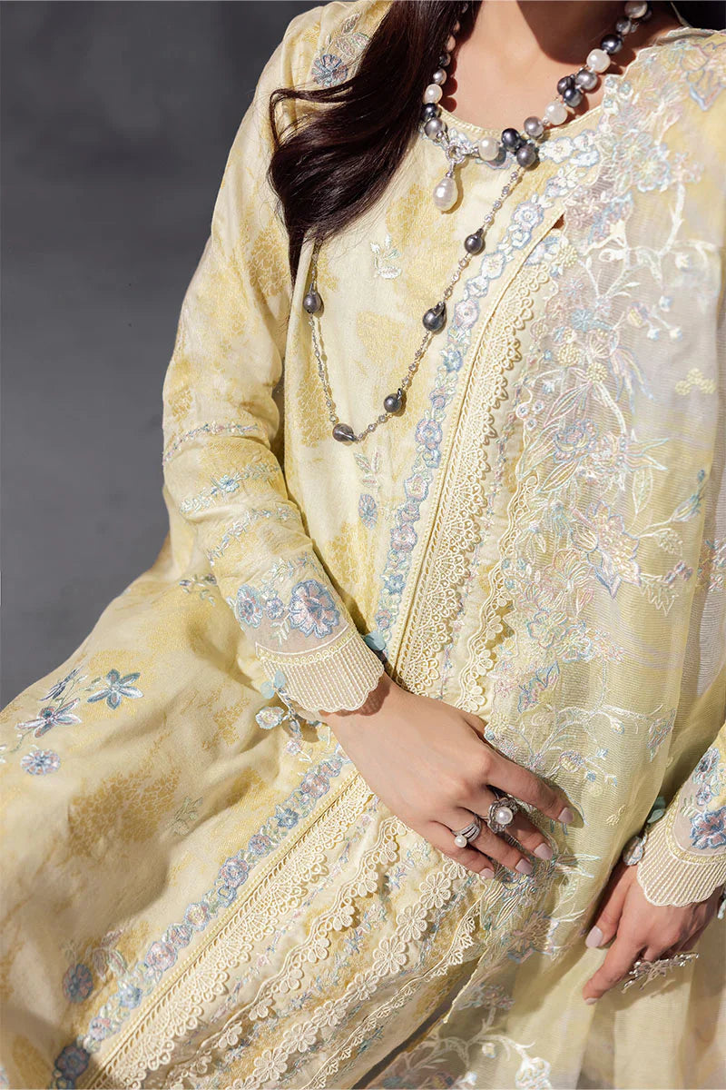 Aymber — sunshine stitched into every detail. In a soft butter yellow hue, Aymber brings a sense of warmth and grace to everyday elegance. Crafted from embroidered lawn with intricate detailing, it’s paired with a printed rocket net dupatta featuring delicate embroidery — a monochrome moment of pure, effortless charm.