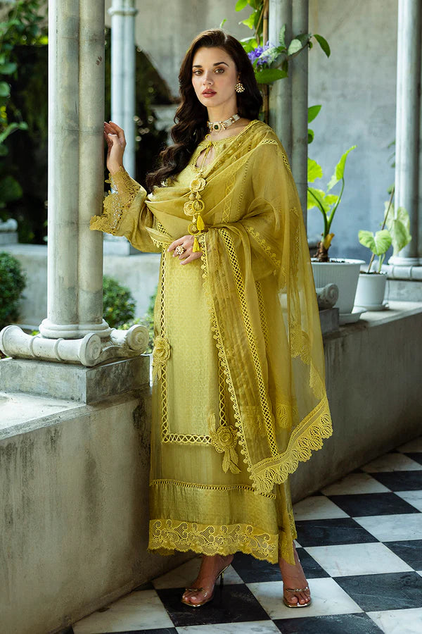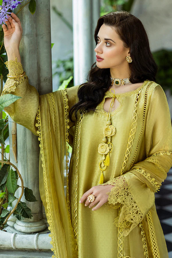 Jules - a stunning ode to timeless elegance. Drenched in a sophisticated olive hue, this ensemble is designed for those who appreciate understated luxury. The jacquard fabric shirt boasts exquisite intricate detailing, adding depth and texture to your festive look. A BM organza dupatta cascades effortlessly, infusing the ensemble with ethereal charm. Raw silk trousers provide a structured yet graceful finish, ensuring a refined silhouette. Lined with a silk inner, offering unmatched comfort and a seamless drape.
