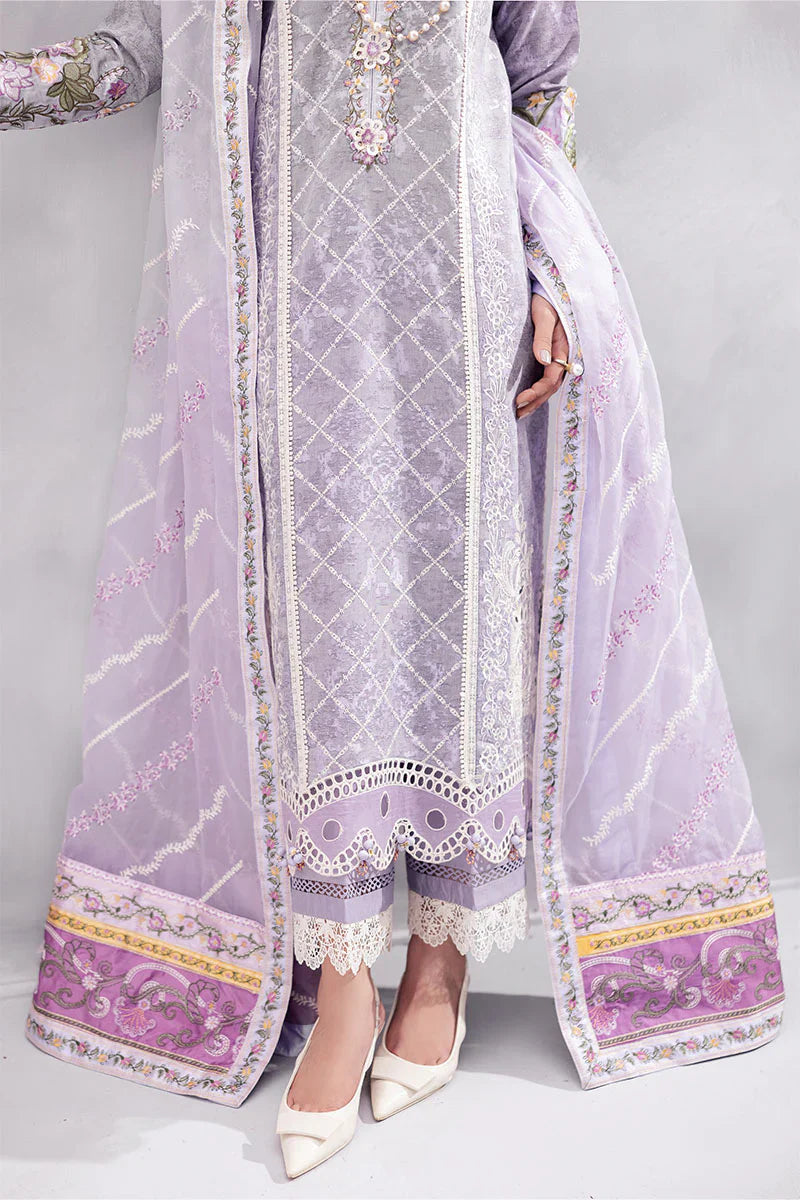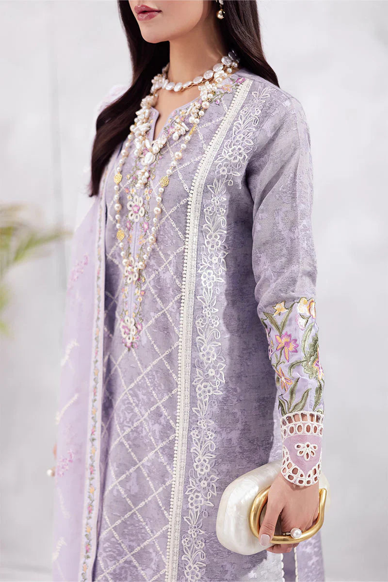 Tasbeel — a vision of soft sophistication. Draped in a soothing lavender hue, this embroidered lawn suit is adorned with delicate, thoughtfully placed detailing that captures effortless refinement. It comes paired with a beautifully crafted dyed B.M organza dupatta, featuring a graceful border — a perfect blend of subtle charm and summer ease.