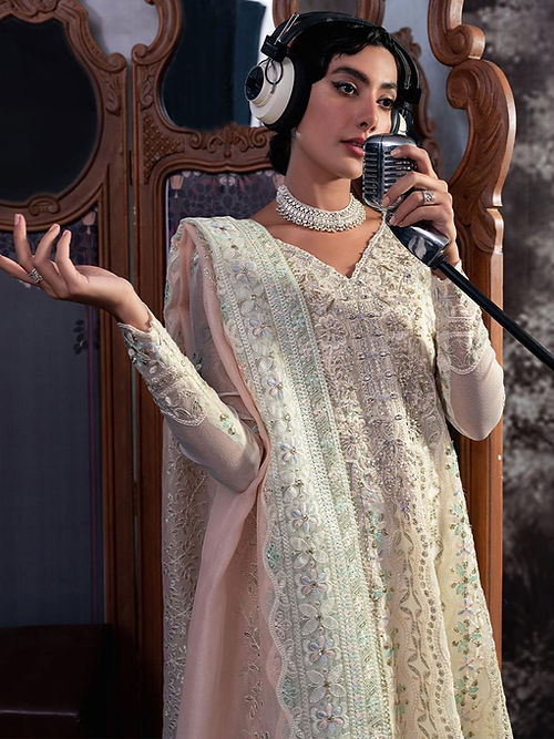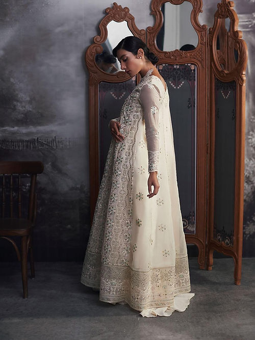 Aaila, a captivating and refined white outfit, is a true testament to the allure of understated elegance. This enchanting ensemble features an embroidered sequin and hand-embellished neckline on delicate organza net, making it a masterpiece of exquisite craftsmanship and meticulous design. The focal point of this extraordinary attire is the intricately adorned neckline. Each sequin and embellishment have been meticulously placed, creating a mesmerizing display of artistry and skill.