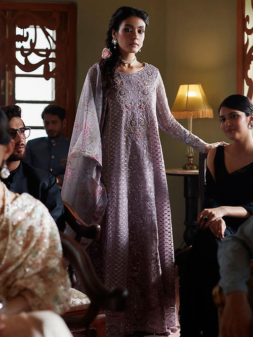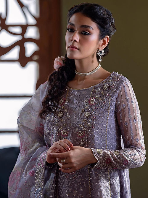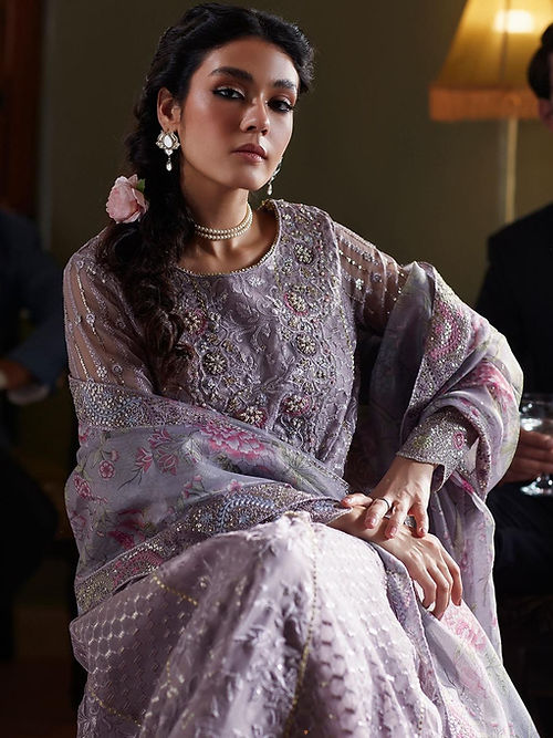 Eira, a mesmerizing outfitin lilac that embodies grace and glamour, is a true masterpiece in the realm of fashion. This enchanting ensemble features an intricately embroidered sequin and hand-embellished neckline on delicate organza net, creating a symphony of opulence and elegance. With meticulous craftsmanship and exquisite finishing touches, Eira is destined to captivate hearts and turn heads.