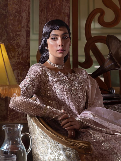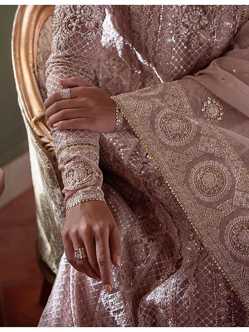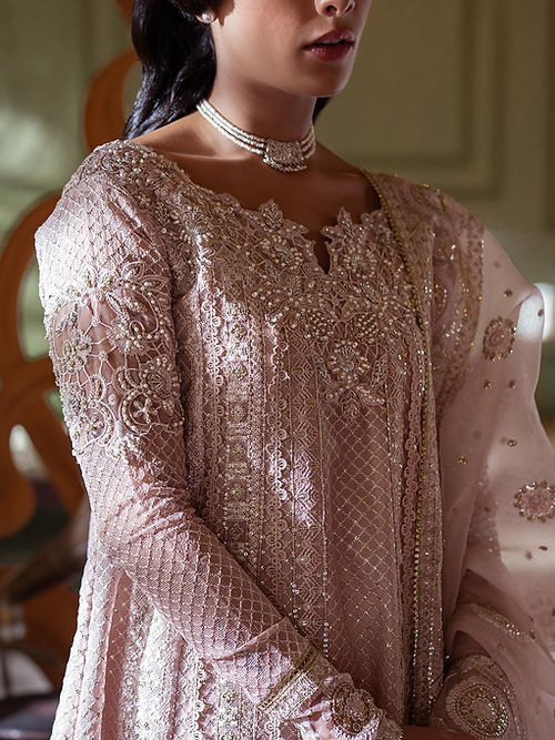 Inaya, a masterpiece of unparalleled beauty, is an outfit that exudes grace and sophistication. Designed to mesmerize in dusty pink color, this enchanting ensemble showcases an intricately embroidered sequins and hand-embellished neckline on a delicate organza net. To add a touch of finesse, Inaya is beautifully finished with a crochet lace. This delicate lace, meticulously woven with precision, enhances the overall elegance of the ensemble.