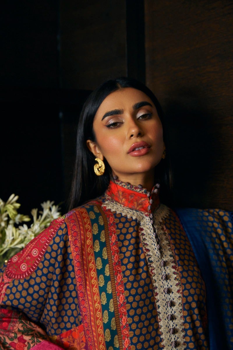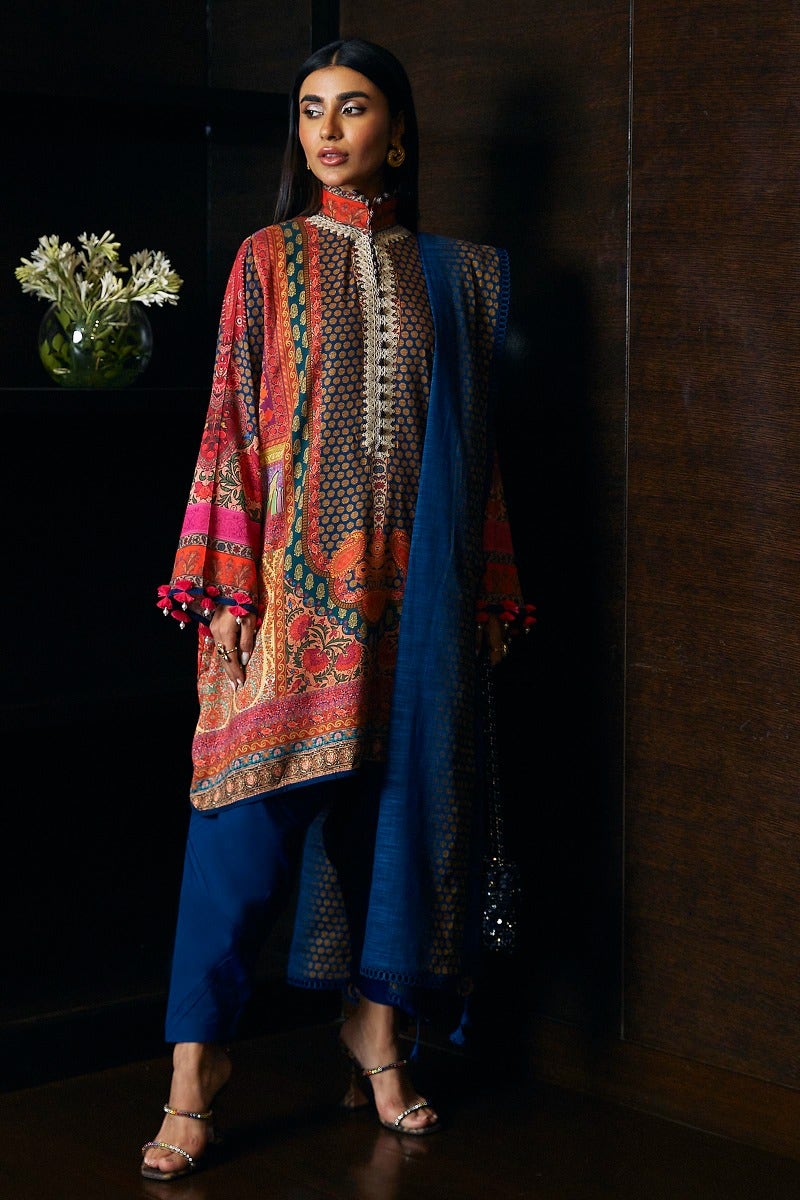 A tapestry of cultural fusion unfolds with the essence of Indian and Moroccan motifs, intertwined like stories of distant lands. The whimsical polka dots add a playful rhythm, while paired alongside cotton-dyed pants, exuding simplicity, and a printed khaddar dupatta, it's an ensemble where threads of tradition and contemporary grace weave a symphony of style.