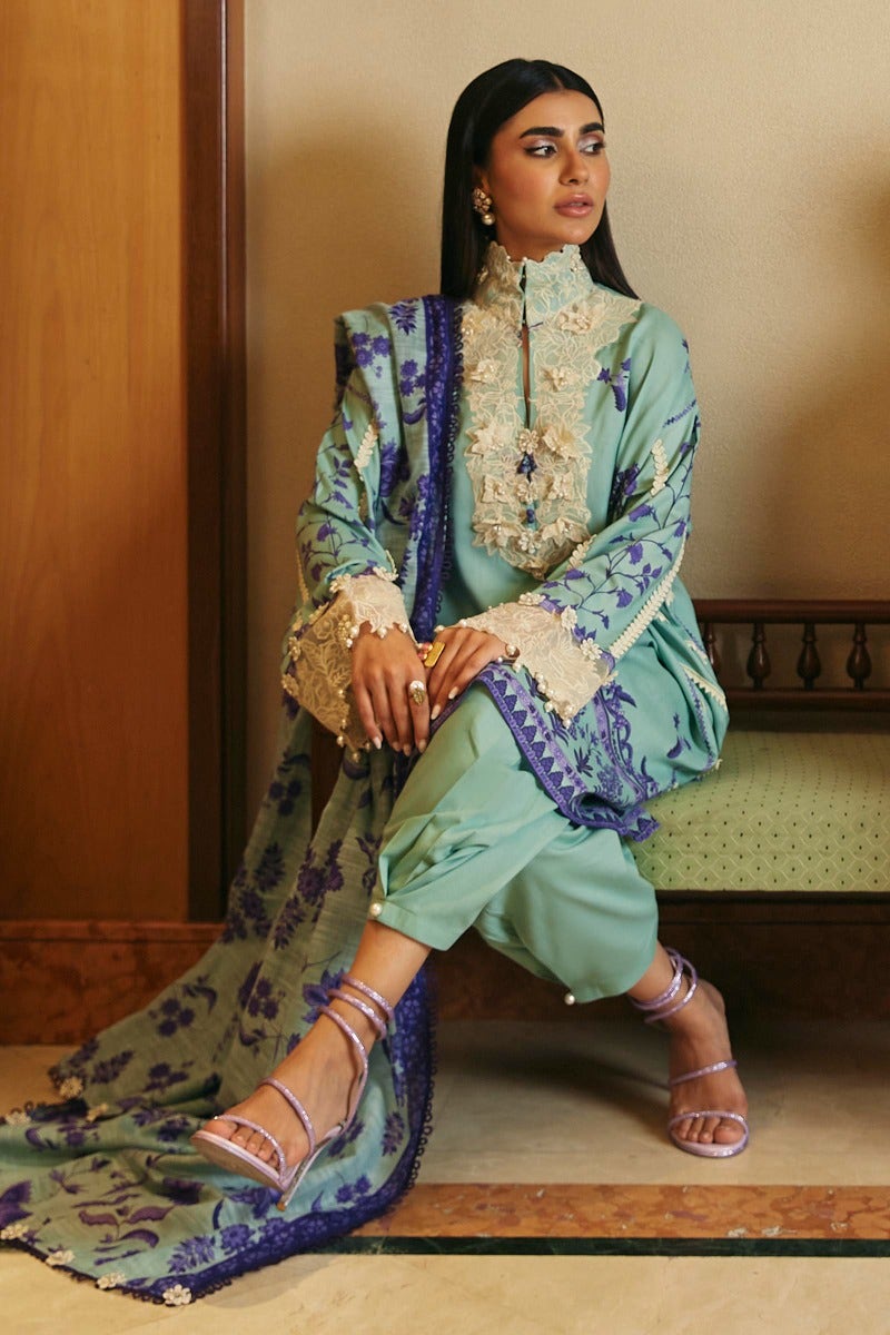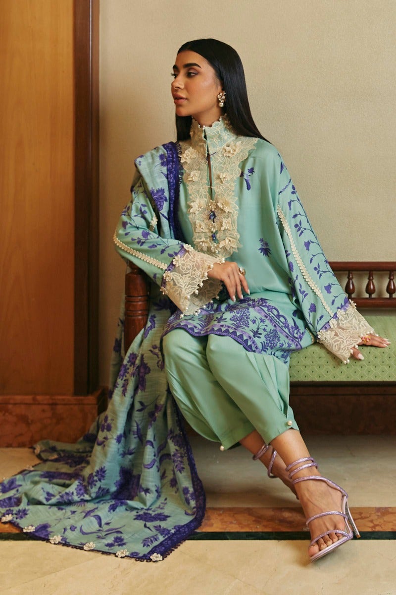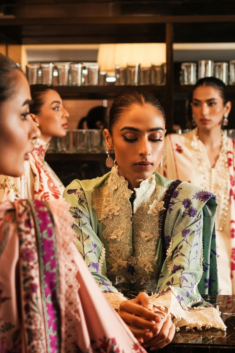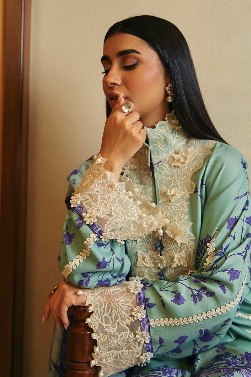In the garden of style, the blossoming elegance of a floral trellis-inspired printed shirt intertwines with the earthy allure of cotton-dyed pants, all crowned by the ethereal embrace of a floral-printed khaddar dupatta.