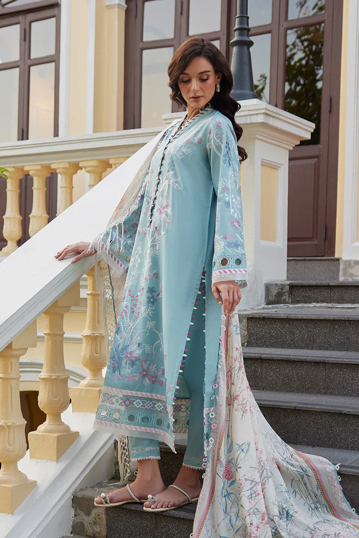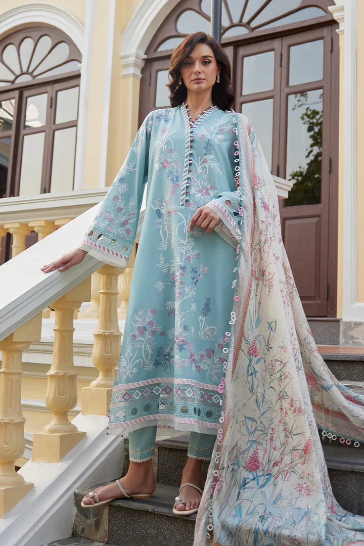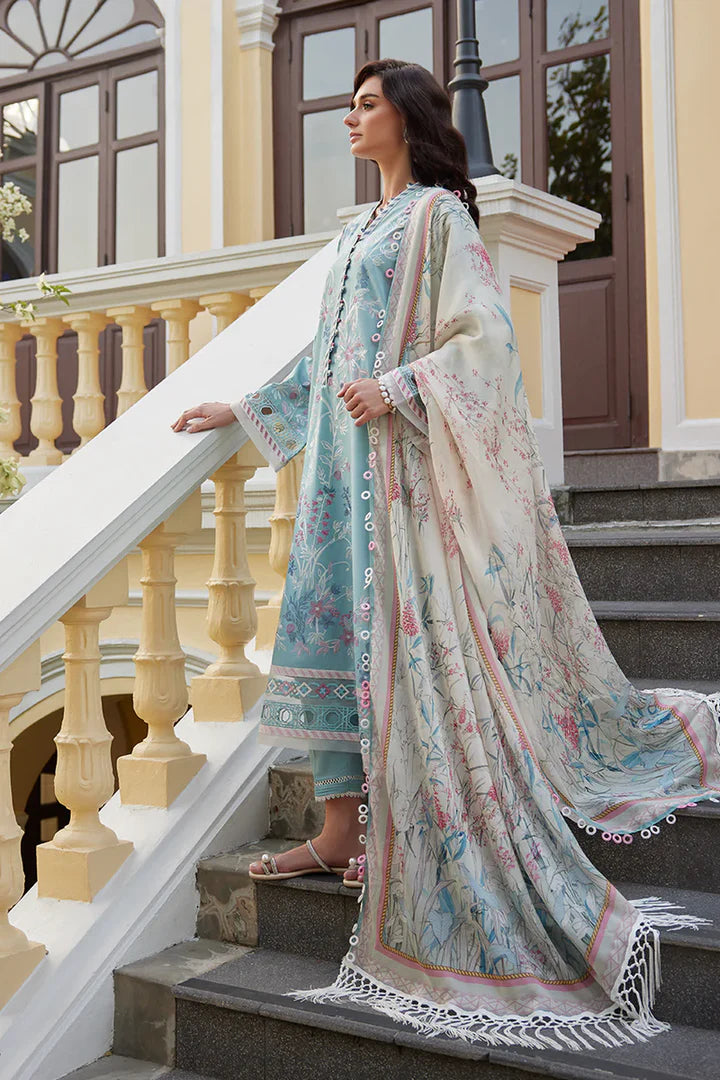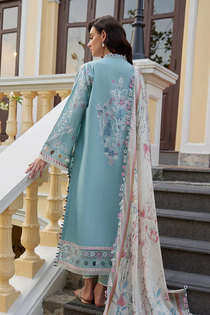 An elegant embroidered shirt in a soft light blue, inspired by delicate French florals. Adorned with intricate cutwork embroidery in shades of pink, grey-blue, and white, this ensemble is gracefully complemented by a pure silk dupatta and matching pants, exuding effortless chic and sophistication.