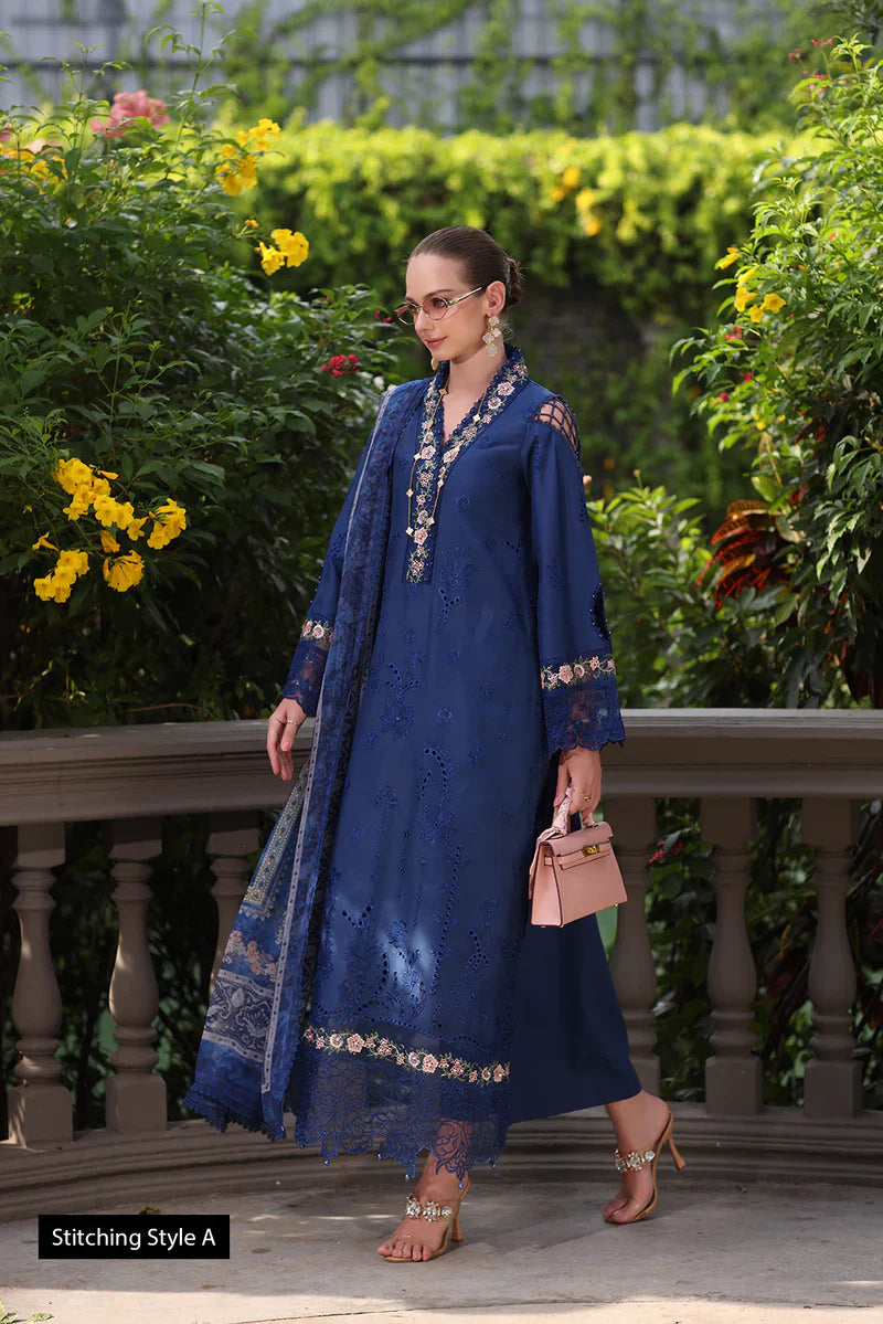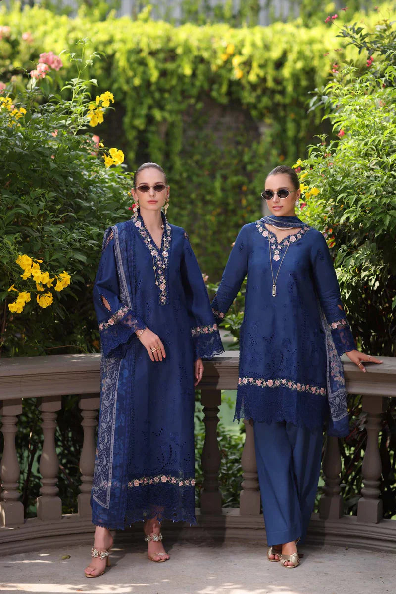 Steeped in the depth of royal blue, this ensemble is a poetic ode to romance and refinement. Its monotonal porous schiffli embroidery whispers elegance through every thread, creating a tactile symphony of texture and grace. Accentuated with multi-colored embroidered floral vines delicately sandwiched between intricate lacy borders, each detail evokes the dreamy cadence of a secret garden in bloom. this look merges classic sentiment with modern allure, making it a timeless statement for the romantically bold.