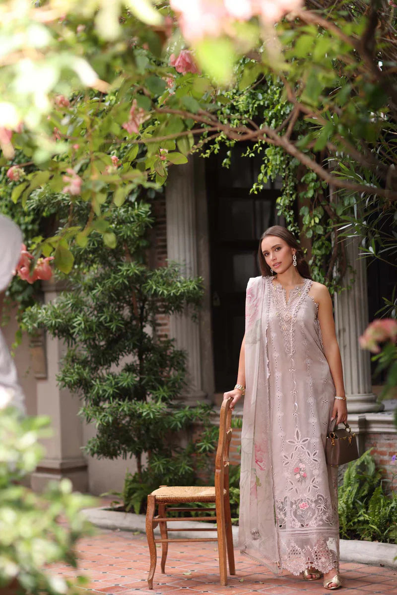 This mink-colored outfit is a true expression of romantic sophistication. Delicate linear schiffli patterns flow seamlessly across the fabric, adding a sense of graceful structure. The look is elevated by exquisite laser-cut organza borders, intricately designed to form stunning frames. Within these borders bloom floral bouquet motifs, beautifully etched onto sheer organza, giving the ensemble an air of refined charm. A perfect harmony of elegance and artistry, this design stands out with its timeless beauty and couture detailing.