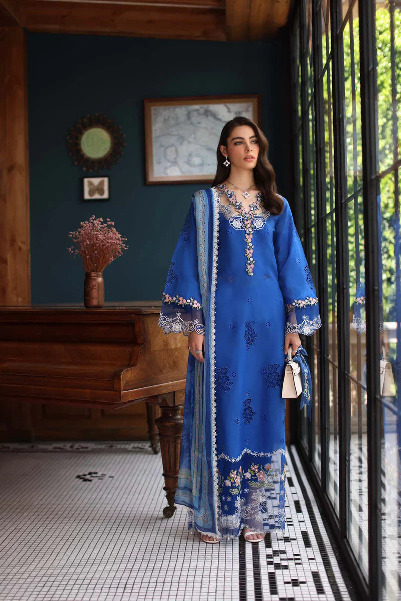 Bathed in an energetic ink blue, this dreamy ensemble blossoms with embroidered French florets in soft peaches and mints—a tender whisper of spring. White lacy borders and trims weave a story of romance, while delicate schiffli embroidery and laser cutworked organza insets lend an ethereal touch. A vision of elegance wrapped in poetic charm.