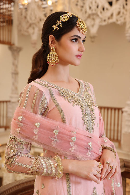 - Sequins & Panni Embroidered Net Dupatta a) Handworked Neckline Encrusted with Kora, Pearls, Rhinestones, and Sequins work b) Handworked Daman Border Encrusted with Pearls c) Silk Border d) Organza Scalloped Daman Border e) Organza Border For Sleeves f) Organza Scalloped Dupatta Border