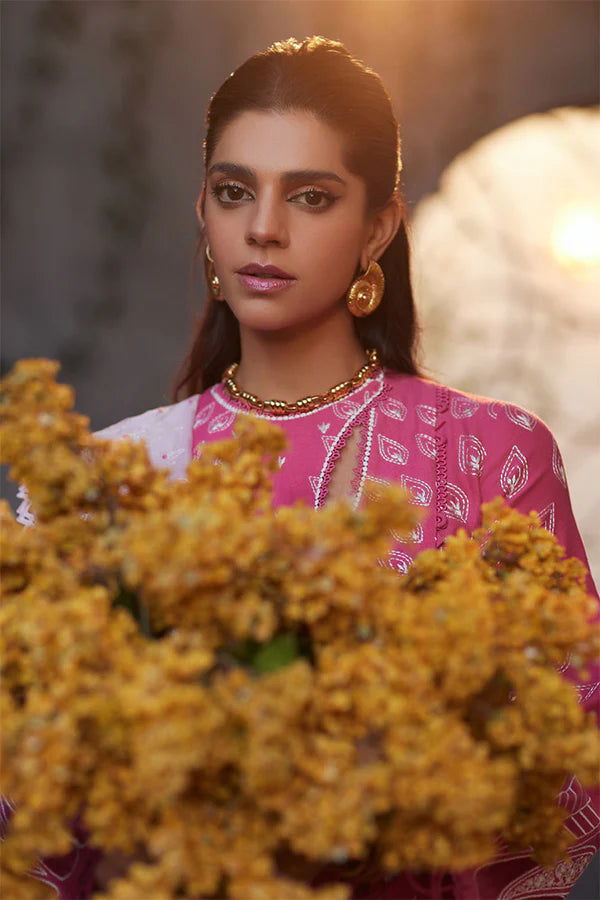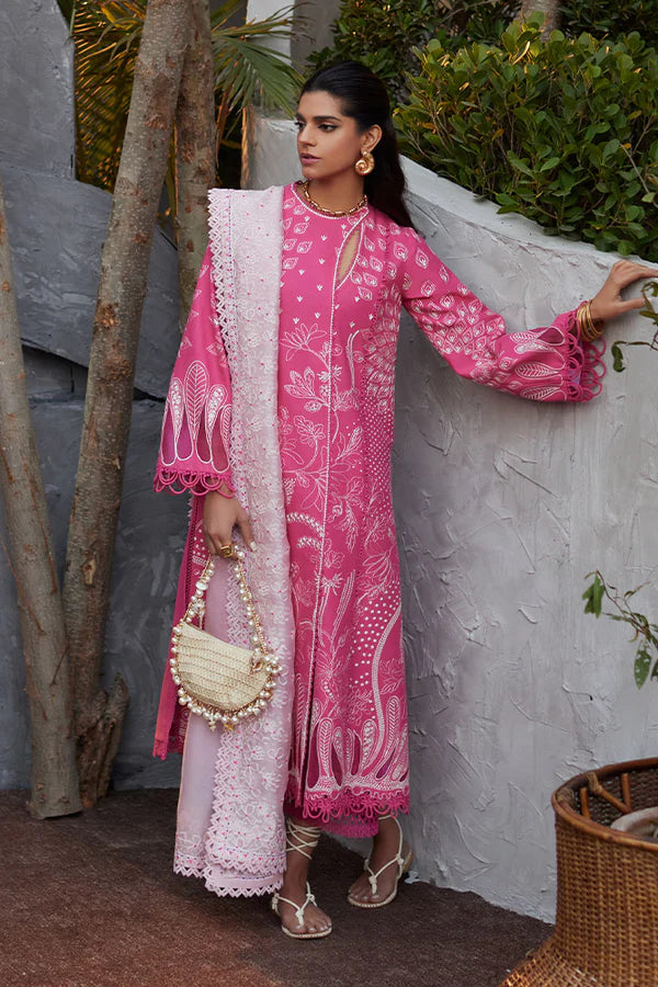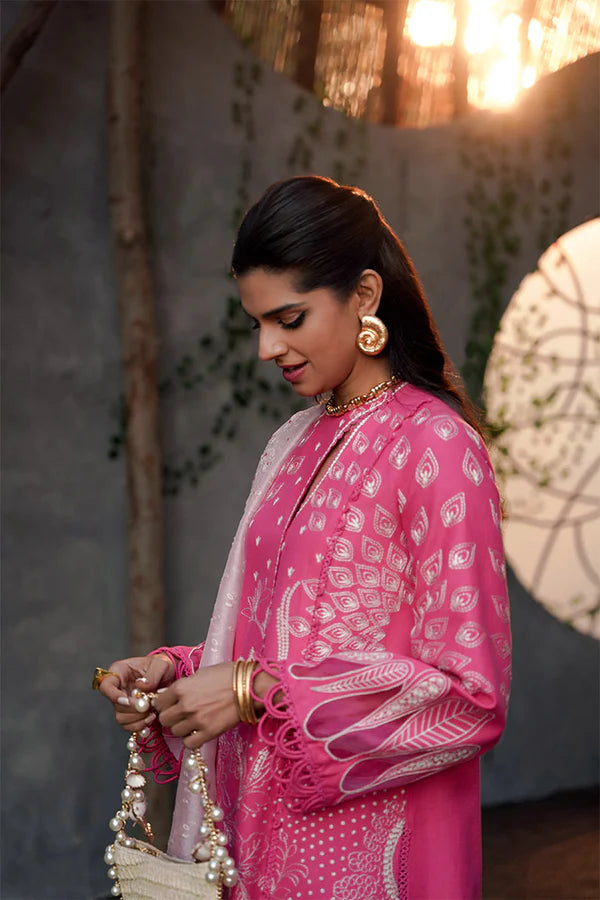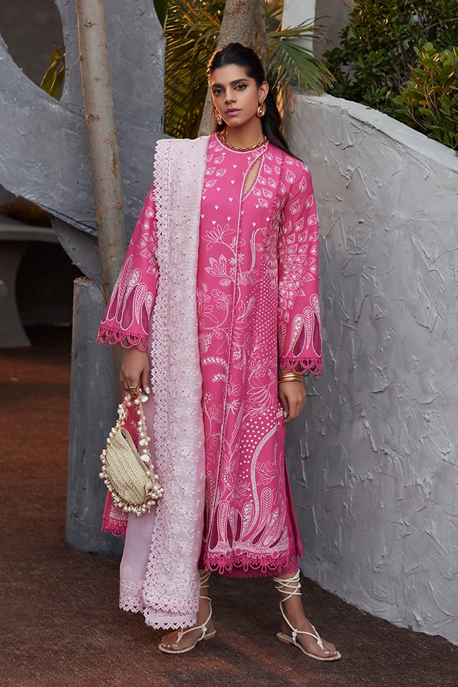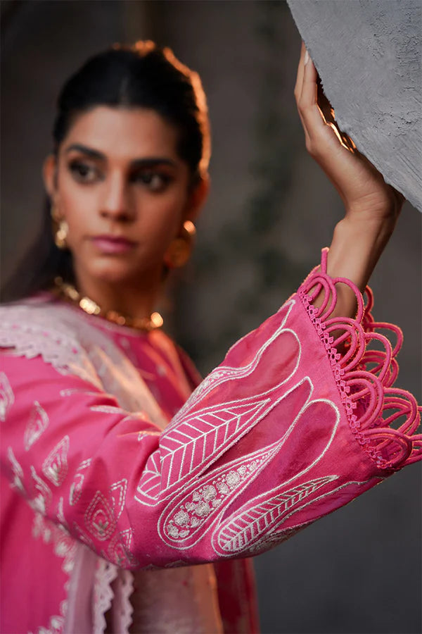 • Candy Pink with front open shirt featuring a contemporary chic neckline. It also includes montone embroidery that complements the contrast.