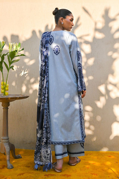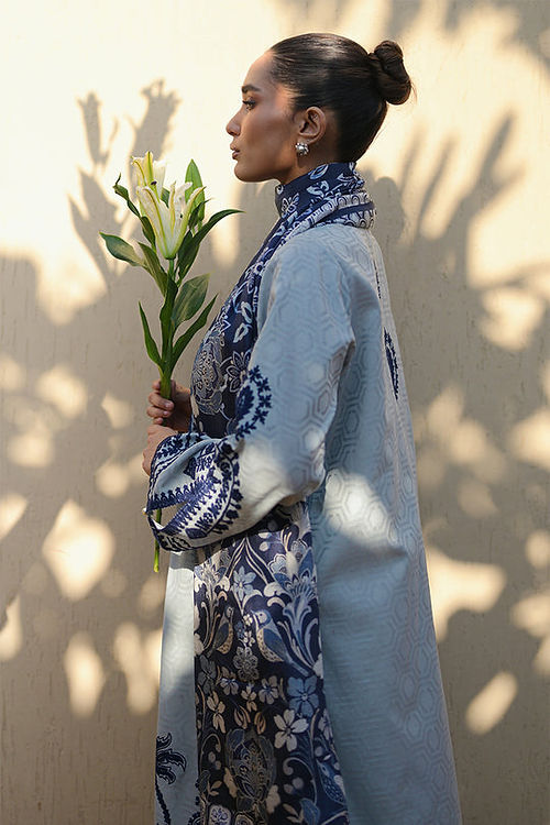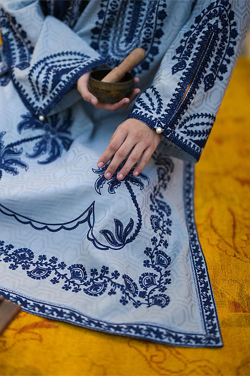 A sky blue jacquard lawn base is artfully rendered with signature SM aari embroidery. Paired with a florally printed navy blue medium silk dupatta and matching jacquard culottes featuring embroidered motifs.