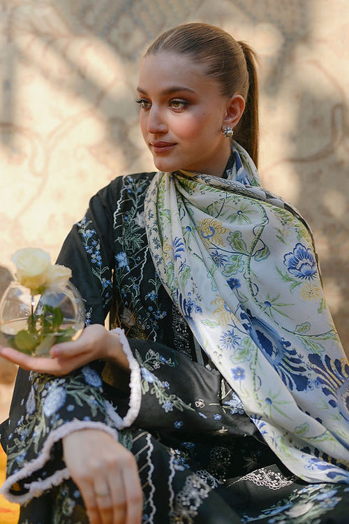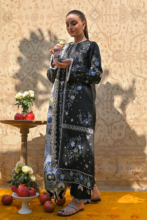 A charcoal jacquard lawn base features intricate and delicately embroidered floral imagery. Paired with a painterly printed medium silk dupatta with abstract motifs and floral vines. Matching jacquard culottes complete the look.