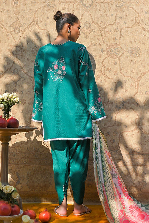 A teal blue jacquard lawn base features intricate and delicately embroidered floral imagery in shades of pink, sage green, and ivory. Paired with a medium silk painterly printed dupatta with abstract imagery and floral vines. A matching jacquard shalwar completes the look.