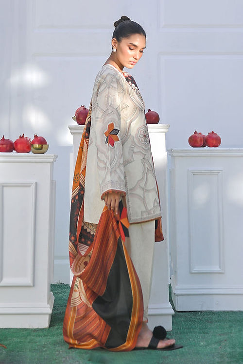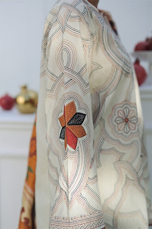 A dreamy ivory jacquard lawn shirt is rendered with delicate kantha and geometric embroidery in earthy hues of terracotta and black. Paired with a rich medium silk dupatta in our signature painterly print and a matching jacquard shalwar with embroidered details completes the look.